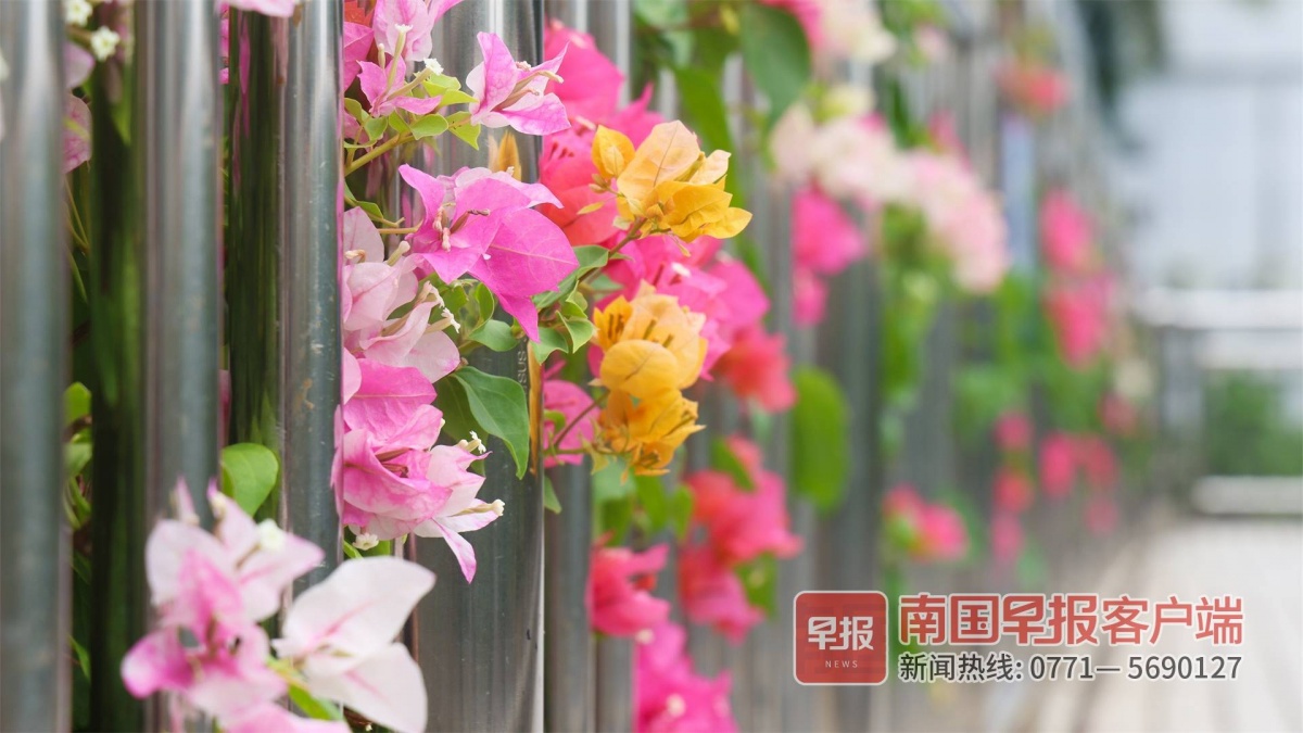 不同颜色的三角梅从天桥的隔离栏中探出。