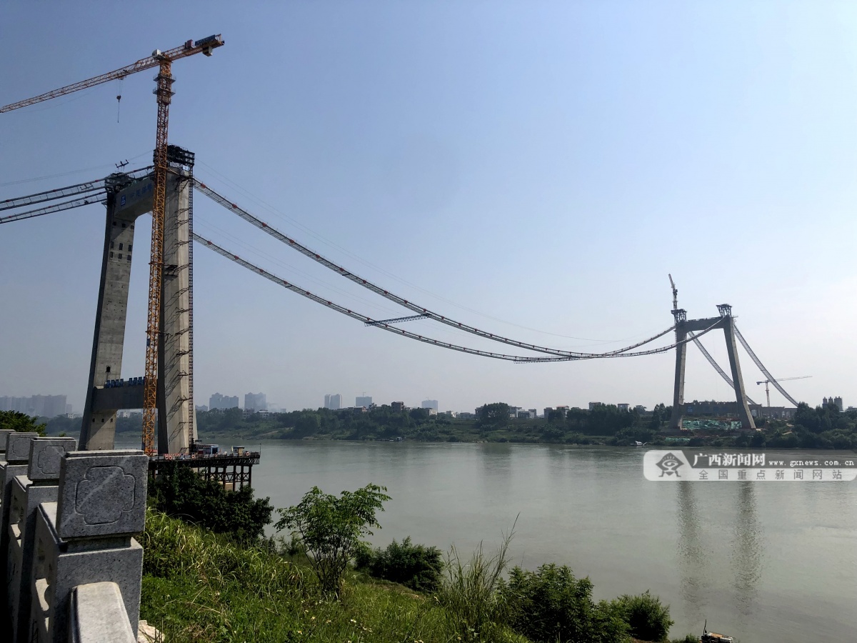 横州大桥作为G324横州市南绕城线公路的关键节点,是横州市连接城区与郁江南岸的第二座桥梁,也是横州人民日夜期盼的重大交通项目。9月6日上午,记者来到正在建设中的横州大桥项目施工现场,看到两条铁索紧紧连接着郁江两岸的大桥主塔,大桥轮廓已初具雏形,“真容”呼之欲出。