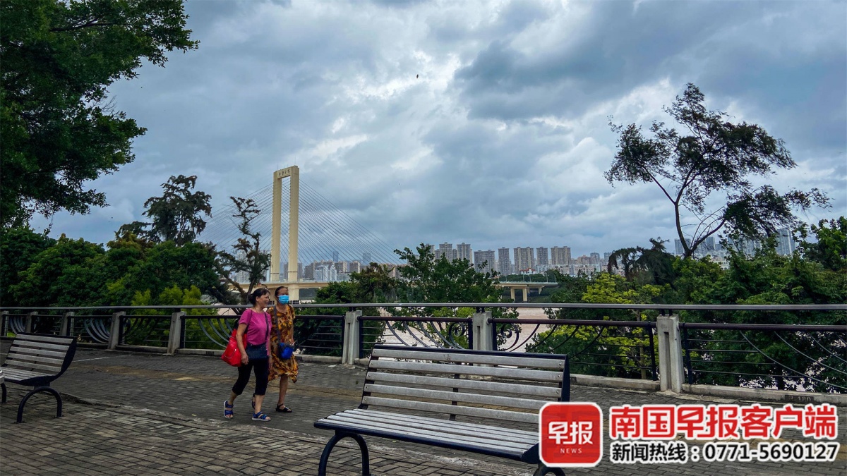 ▲9月8日下午,两市民在邕江边散步,身后的天气已由晴转阴。南国早报记者 游拥军 摄