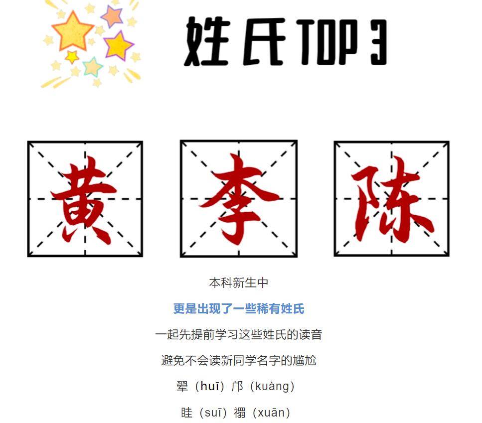 今年,哪些姓氏的新生最多?记者梳理各校大数据发现,黄、李、陈等这三个姓的学生最多。在桂林电子科技大学(桂林校区),这三姓已连续3年占据该校新生姓氏榜前三。这届新生中还有一些姓氏比较稀有,例如广西大学有87个姓在萌新中是独一无二的存在,含、边、承、首、拔……有些你可能还是第一次听说吧?而一些高校的新生姓氏读音还很生僻,例如翚(huī)、邝(kuàng)、眭(suī)、禤(xuān)、逯(lù)、 亓(qí)等,这些你都会念吗?