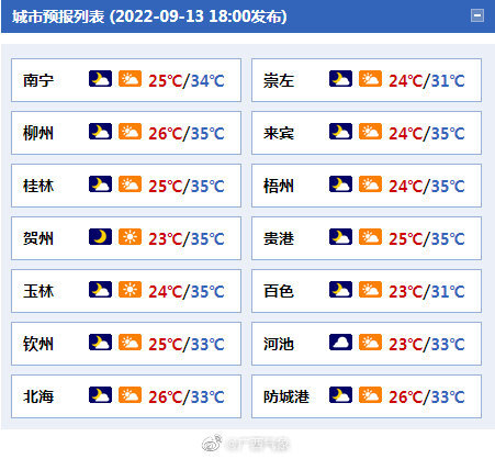 南宁市:今天白天,多云、午后局地有阵雨或雷雨,东北风1~2级,最低气温25℃,最高气温34℃。