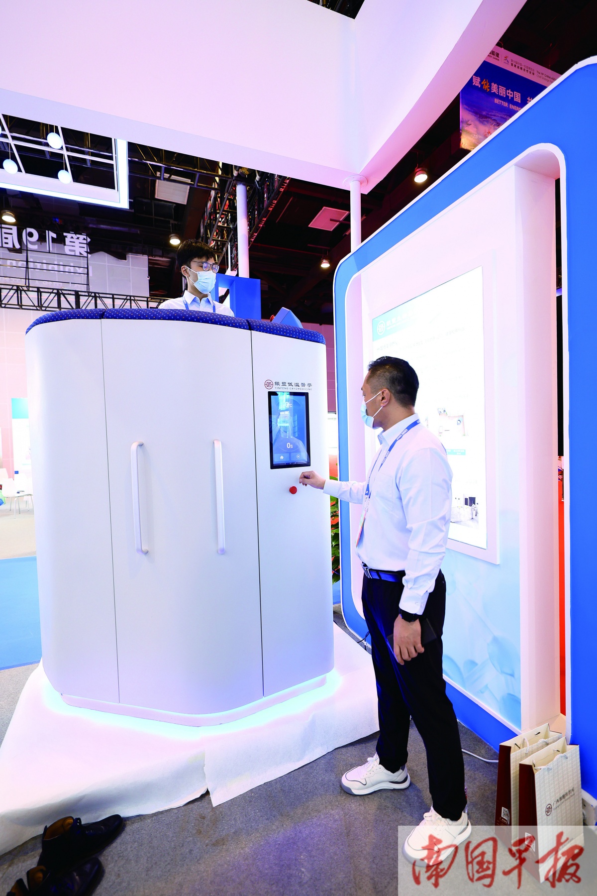 工作人员演示如何操作低温冷疗舱。记者 邹财麟 摄