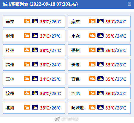 9月18日广西多云天气为主 大部气温较高