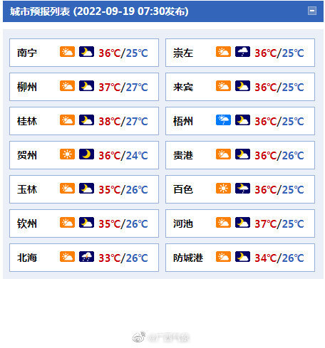 19日晚上到20日白天,全区多云,其中桂西部分地区和沿海地区有小到中雨、局地大雨到暴雨并伴有短时雷暴大风等强对流天气。最高气温:桂东部分地区34~36℃、局地37℃以上,我区其它地区30~34℃。
