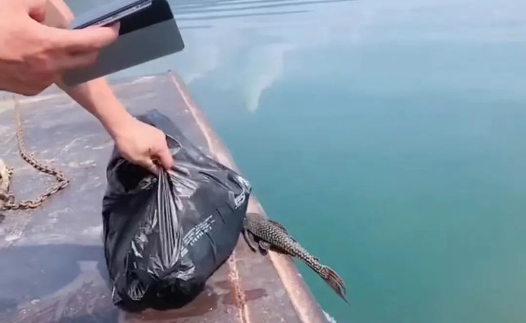 网传视频显示,有人乘船在水中放生数条“清道夫”,边放生边说“见者都有福气”。