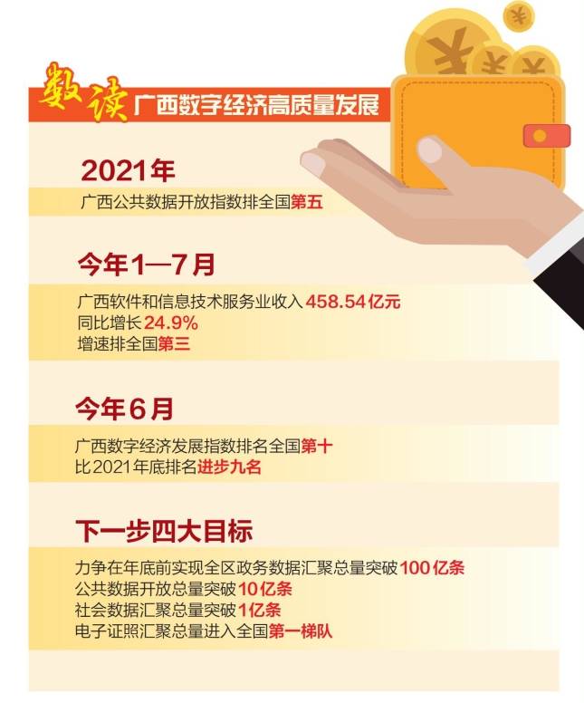 据中国信息通信研究院权威发布,今年1—7月数字经济核心产业的重要指标——广西软件和信息技术服务业收入458.54亿元,同比增长24.9%,增速排全国第三。截至今年6月底,全区数字经济企业发展到1.45万家。据广西大数据研究院研究成果,今年6月,广西数字经济发展指数排名全国第十,比2021年底排名进步九名。