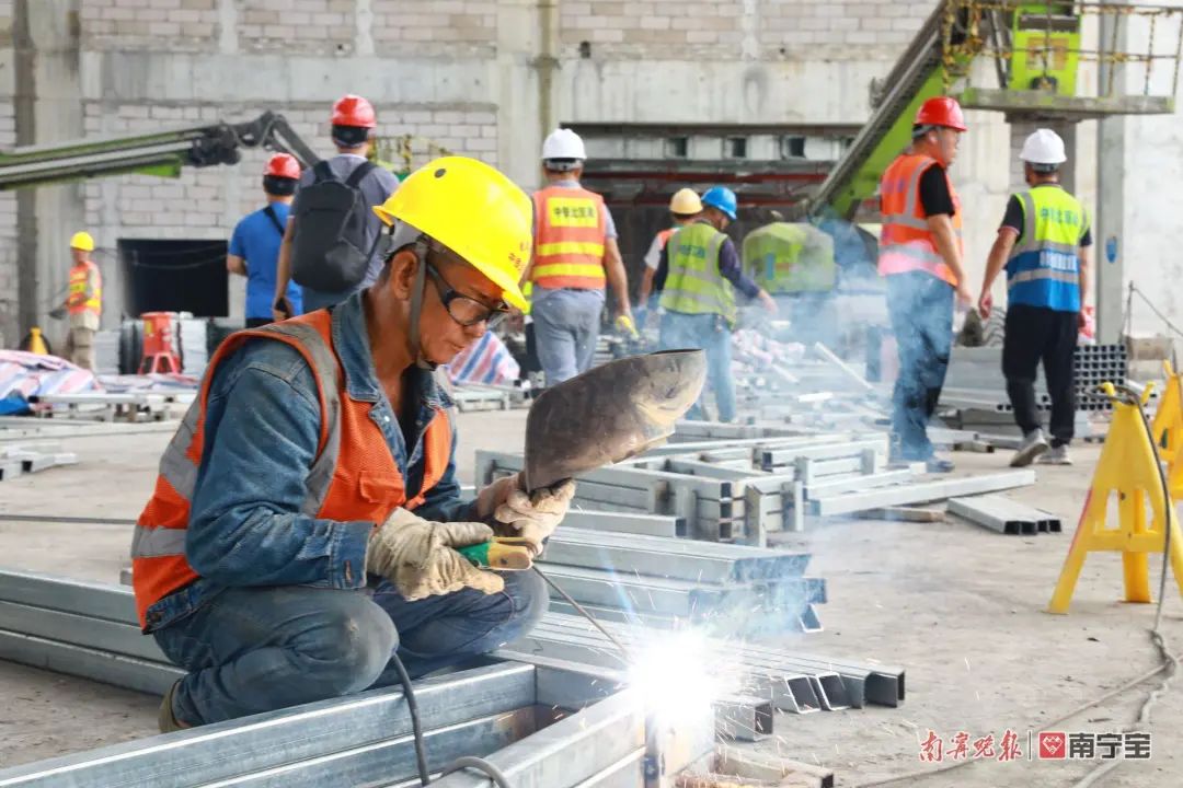 施工人员在焊接车站玻璃幕墙龙骨。南宁晚报·南宁宝客户端通讯员 莫小斌 摄