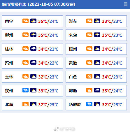 南宁市:今天白天到晚上,多云到晴,局地有阵雨,偏东风1~2级,最高气温35℃,最低气温24℃。