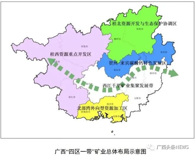 《规划》明确,规划结合全区工业布局,统筹谋划形成“四区一带”矿业发展总体布局:即桂西资源重点开发区、北部湾外向型资源加工区、贺州—来宾碳酸钙特色发展区、桂北资源开发与生态保护协调区和西江千里矿业集聚发展带,推动全区矿业差异化、特色化发展。