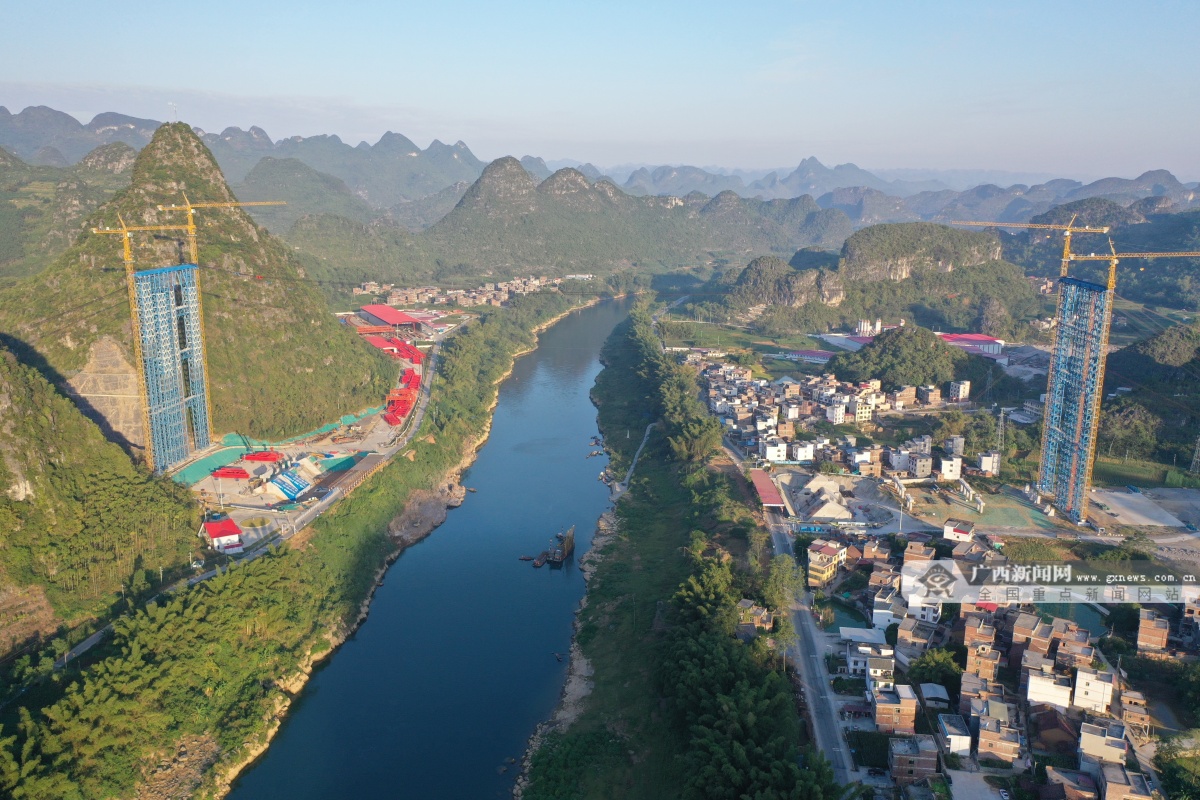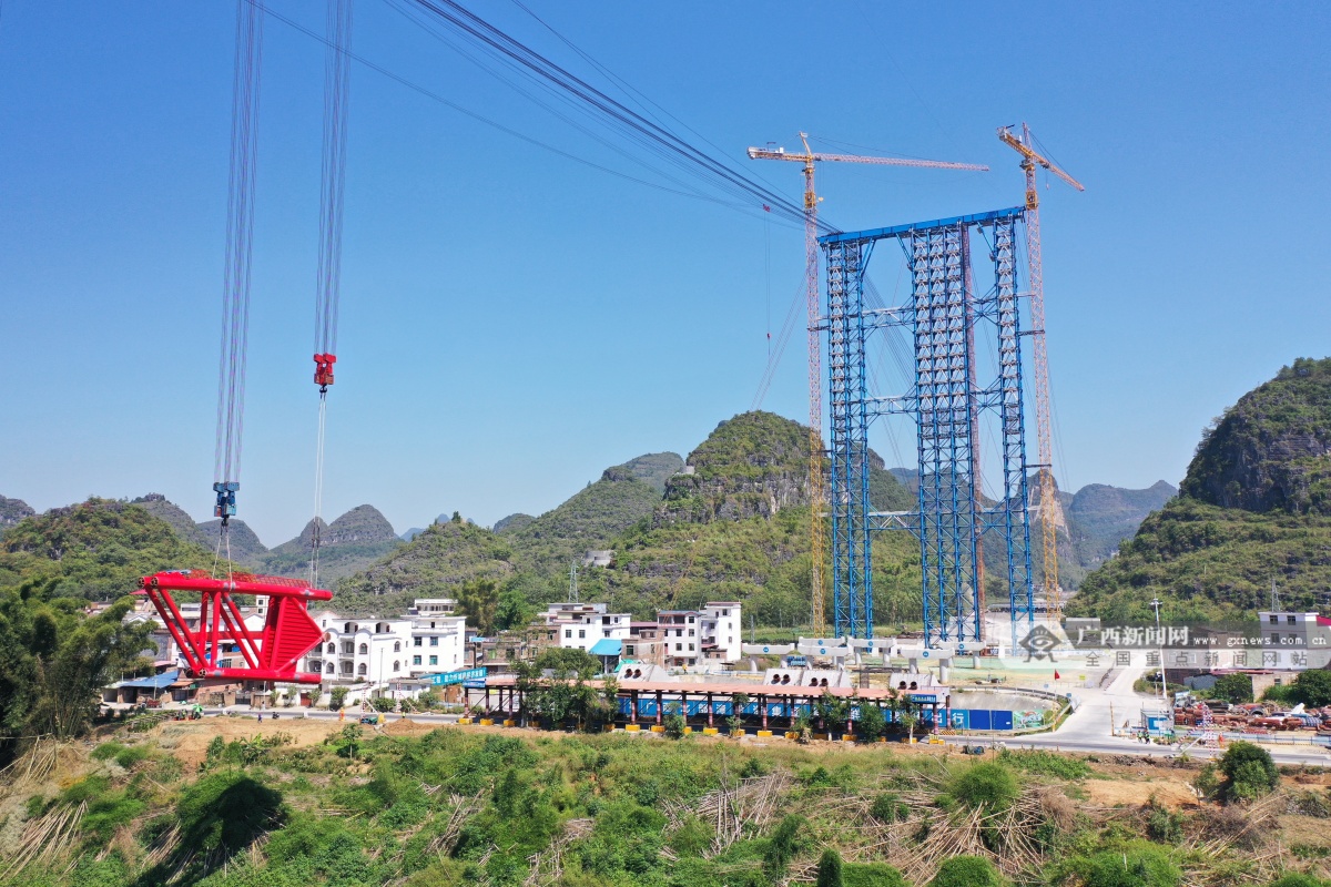 武忻高速是《广西高速公路网规划(2018~2030)》“1环12横13纵25联”中“联6”高速公路的重要组成部分,项目全长118.744公里,投资概算186.12亿元,由广西新发展交通集团投资建设。新圩红水河特大桥分为主桥和连接线桥,均为跨径325米的中承式钢管混凝土拱桥,每座桥钢管拱肋共28个节段,横联12个节段,单个节段最大吊重139.52吨,是武忻高速重点关键控制性工程。此次吊装的1#节段拱肋长27.4米、宽3米、高11.1米,重111.33吨,拱肋采用缆索吊装及斜拉扣挂施工工艺,可实现拱肋高精度合龙,并通过缆索起重机智能化控制系统实现快速就位吊装。连接线桥连接了新圩乡、红渡镇,目前两岸群众只能通过轮渡或者绕行36公里才能到达对岸,耗时50分钟以上。待连接线桥建成后,通行时间将缩短至5分钟,极大便利了当地群众出行。