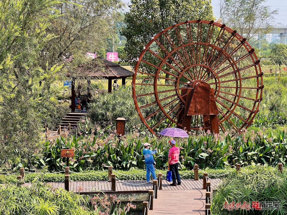 那考河湿地公园从2015年3月起,引入了海绵城市的建设理念,通过设置大量下沉式绿地、雨水湿地、植草沟等“海绵体”,对雨水进行自然调节,经过两年多的治理工程,原先的臭水沟变成了鸟语花香的公园。大片种植的美人蕉是完成生态净化的“大功臣”,因为它不择土壤、耐水,在所有实验的植物中脱颖而出。