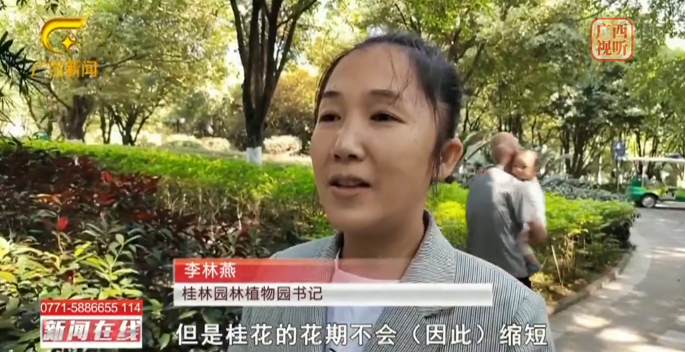 桂林园林植物园书记 李林燕:花期延迟主要是因为这个天气干燥,还有这个雨水缺少。但是桂花的花期不会因此缩短。
