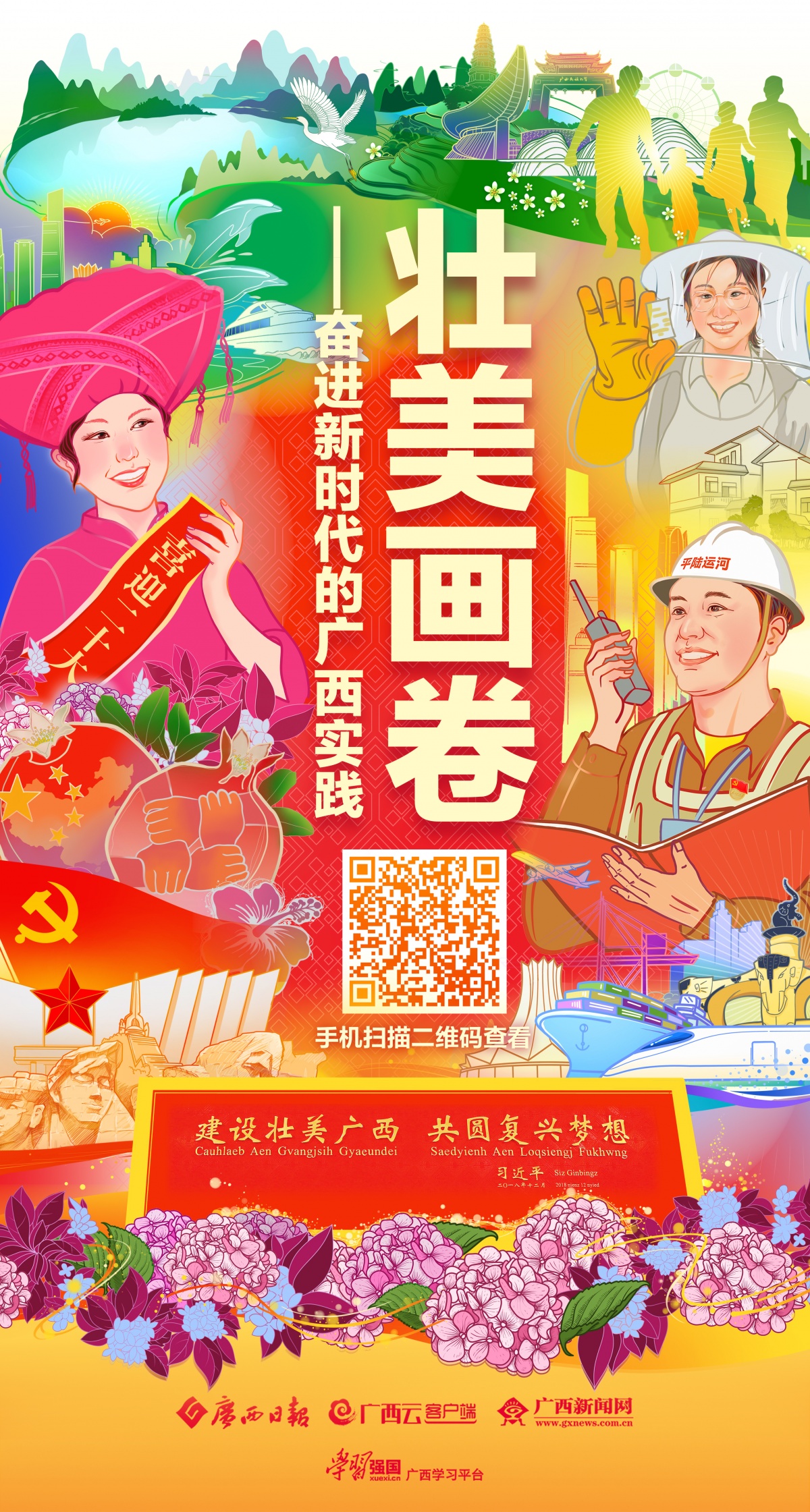 广西日报隆重推出十连版(共20个整版)手绘长卷《壮美画卷——奋进新时代的广西实践》。