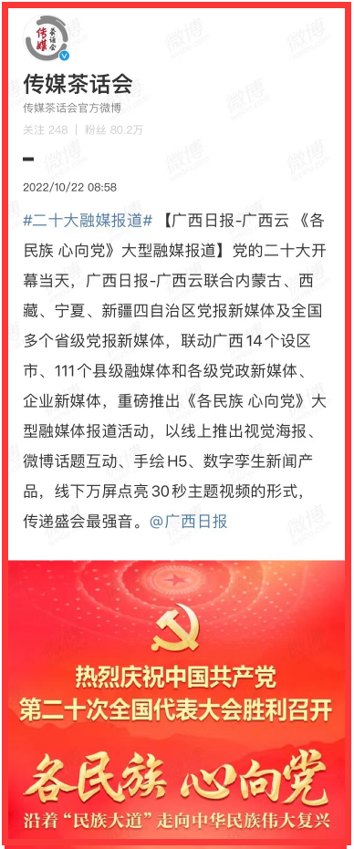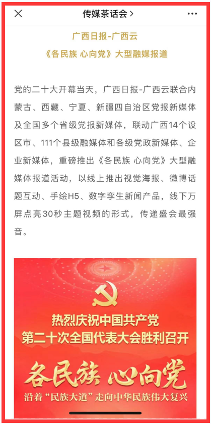 “美编之家”微信公众号转载展示《各民族 心向党!五自治区党媒联手共推精美手绘H5欢庆盛会》《长卷|广西日报重磅推出十连版》;“视听广电”微信公众号转载《党的二十大报道解锁“新”技术,AI数字人惊艳亮相》;“广电猎酷”微信公众号《“广西云”数字主播惊艳亮相 融媒产品有声有色》。