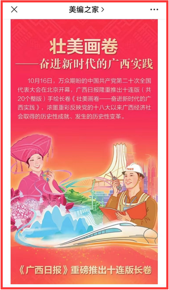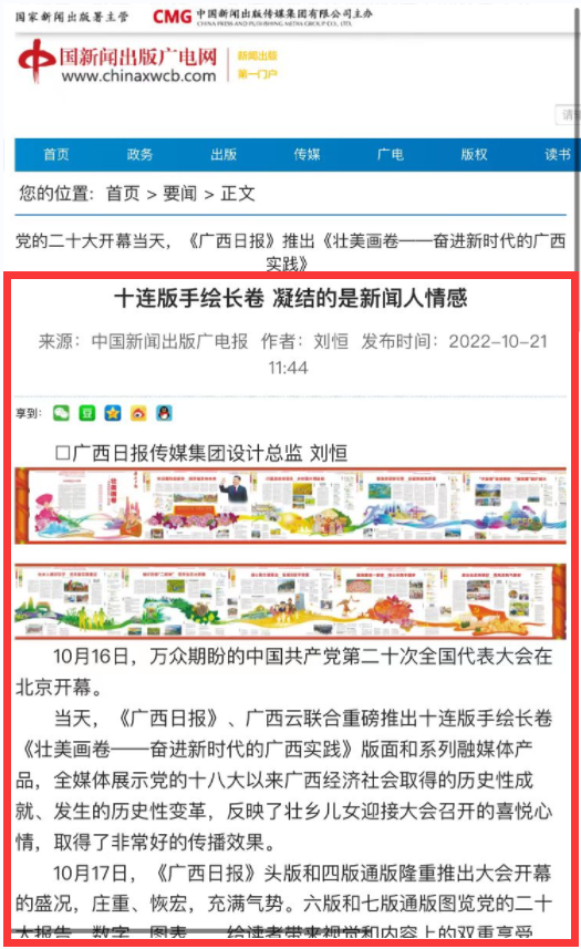 中国新闻出版广电报刊发《十连版手绘长卷凝结的是新闻人情感》(党的二十大开幕当天,《广西日报》推出十连版手绘长卷《壮美画卷——奋进新时代的广西实践》)