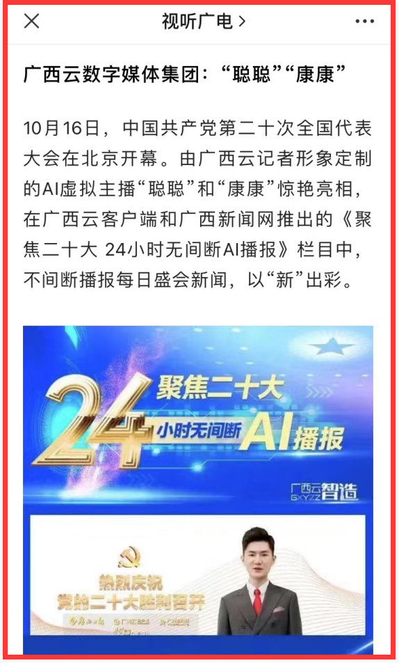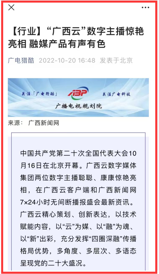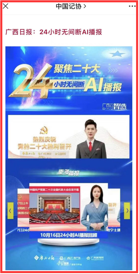 ①《AI数字人亮相党代会报道|二十大·观媒》集纳7家媒体的AI数字人报道产品,广西云的《聚焦二十大24小时无间断AI播报》栏目列为其中。