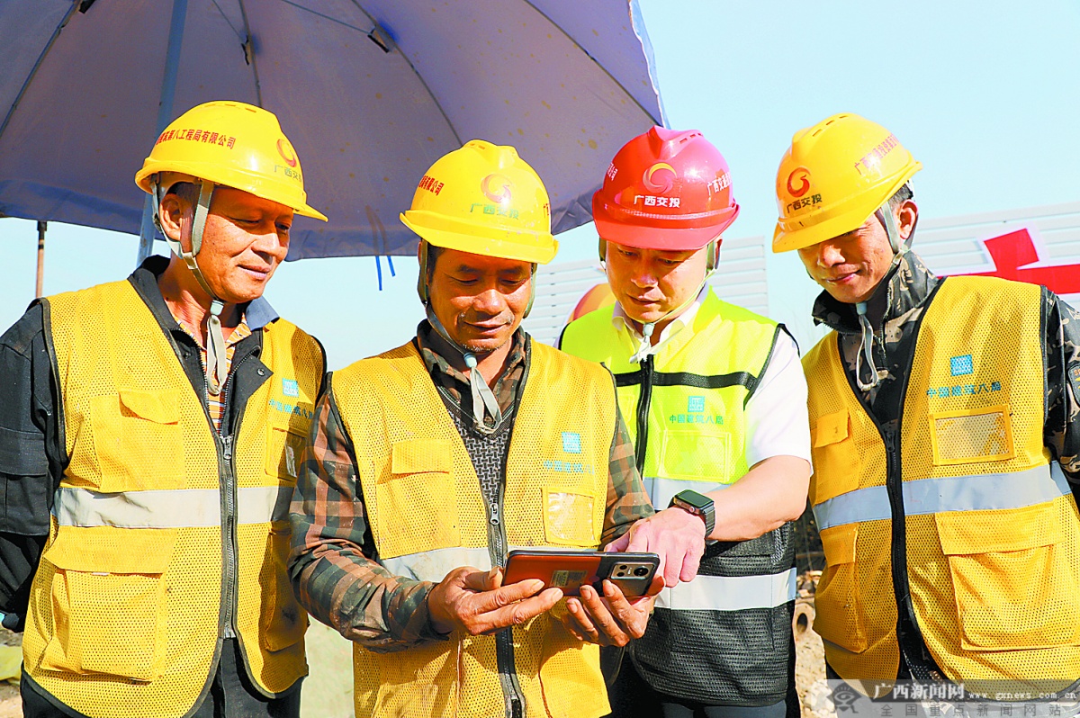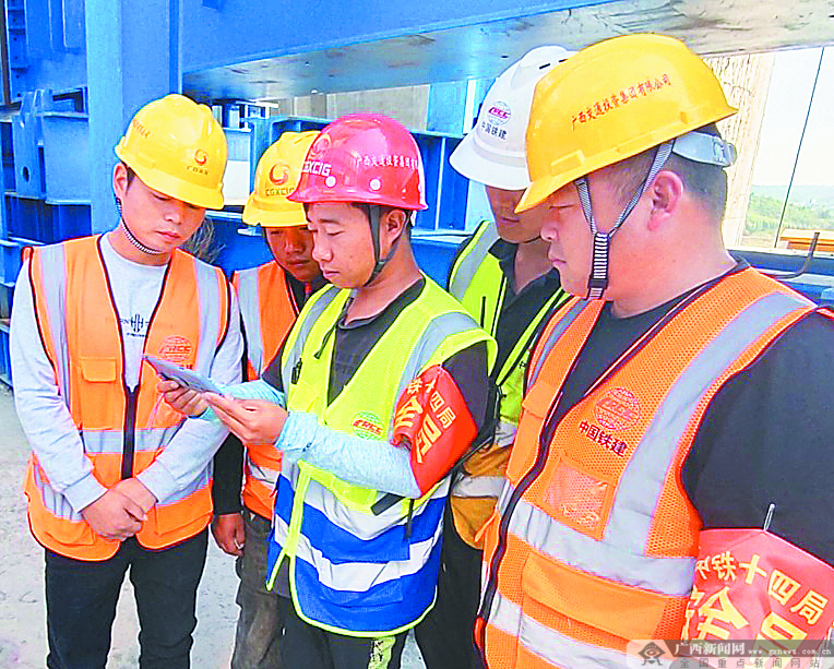 10月22日,在南玉铁路青龙江特大桥架梁建设间隙,来自中铁十四局的一线施工人员通过手机收看党的二十大闭幕会相关报道。广西日报-广西云客户端记者 何学俏 摄