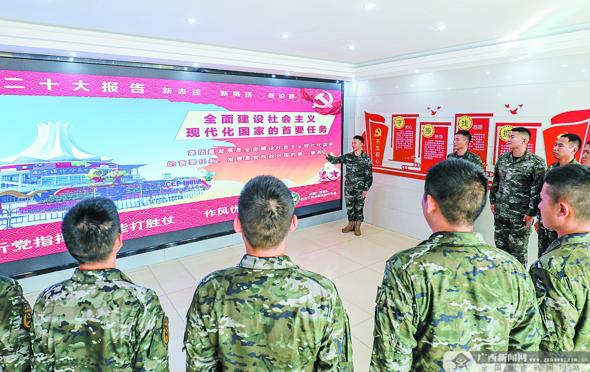 10月23日,武警贵港支队基层中队官兵正在学习领会党的二十大报告精神。连日来,该支队利用板报、集中学习、开设主题图书角等形式,在营区迅速掀起学习二十大报告精神热潮。管健龙 摄