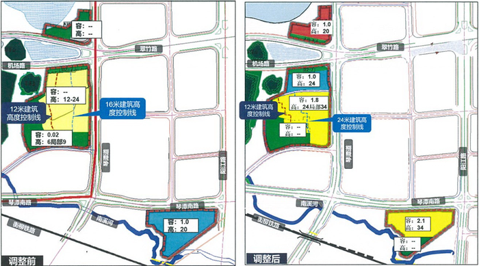 2、道路调整调整内容:规划拟在琴潭道上增设辅道,在琴潭岩东侧新增一条12米道路,增加片区道路网密度,同时拟将琴潭南路在T字路口的中央绿化带进行封闭,以解决片区地块交通出行开口问题。周边用地随道路红线的变化进行微调。3、容积率、高度等相关指标调整调整内容:商业用地规划建议低强度开发,规划调整后,商业用地容积率为1.0,建筑高度15米,建筑密度35%,绿地率25%。体育用地:为便于城市主要道路交叉口附近城市形象的打造,规划建议在不影响城市景观风貌基础上,适当提高开发强度,由原规划容积率1.0,建筑高度20米,建筑密度25%,绿地率35%调整至容积率1.2,建筑高度24米,建筑密度40%,绿地率25%。村庄建设用地、居住用地:原规划中琴潭岩村按照现状保留,仅对建筑高度提出控制要求,建筑高度12-24米。