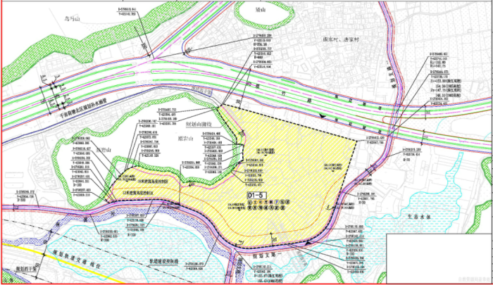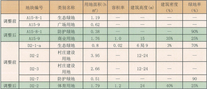 1、地块边界优化调整调整内容:根据相关部门提供的矢量数据,原规划地块西北面和西面有部分林地,用地面积约0.22公顷,本次规划拟将其调出D1-5地块规划范围,并对地块边界作进一步优化和规整。调整后D1-5地块面积由11.02公顷调整为10.78公顷,用地规模减少约0.24公顷。