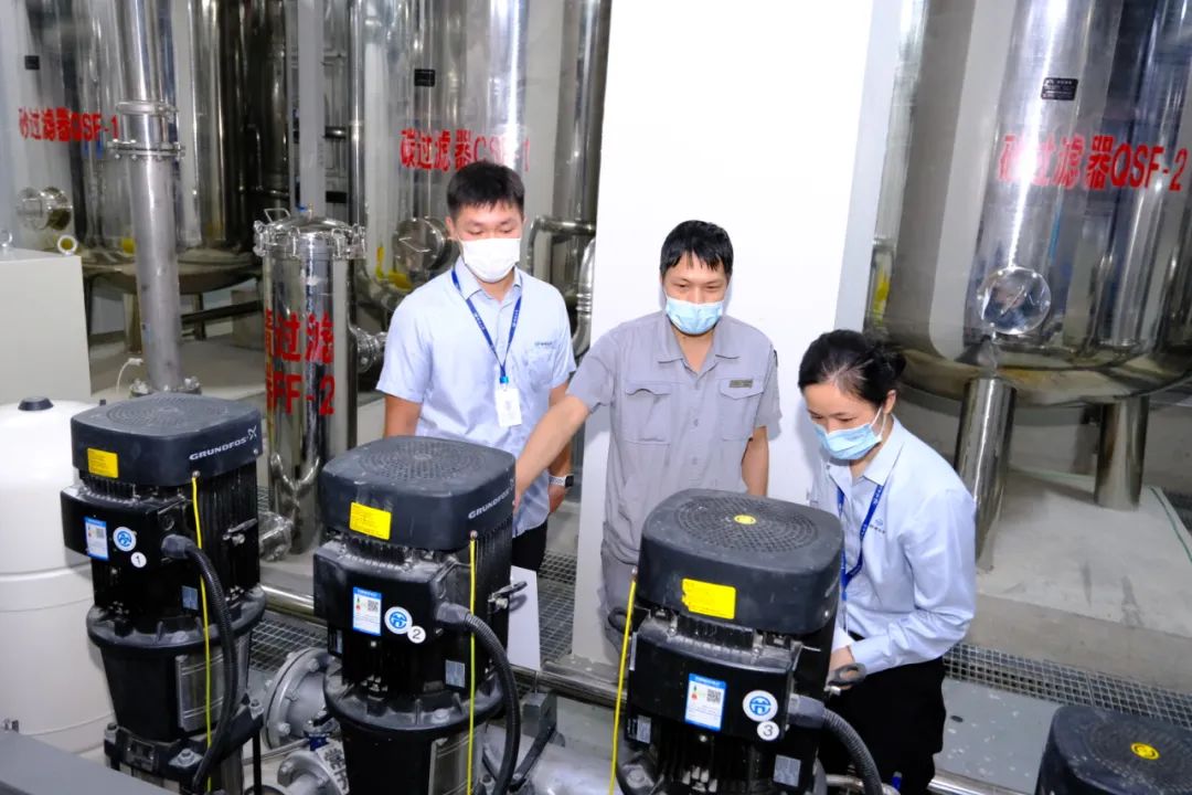 2022年9月初,广西绿城水务股份有限公司营业处二供技术管理班的工作人员,在南宁一家酒店巡检二次供水设备运行情况。记者 尹世斌 摄