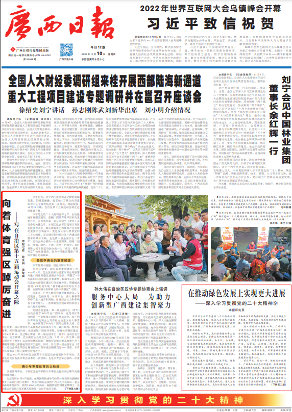 自治区党委、政府高度重视体育工作。2018年7月,自治区政府与国家体育总局签署共建广西体育强区战略合作协议,明确了7个方面52大项具体任务和清单。2020年6月,我区出台体育强区建设行动实施方案,明确提出将用15年时间实现“基本建成体育综合实力强、在国际国内有影响力的体育强区”目标。