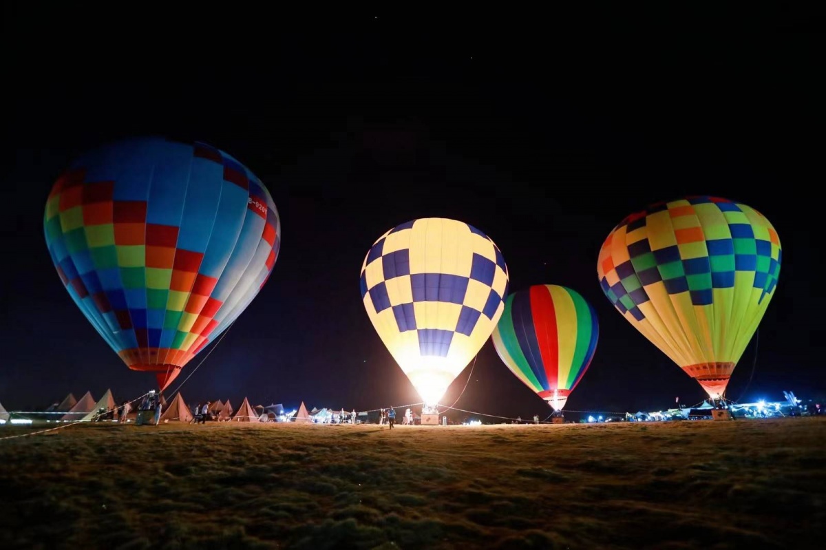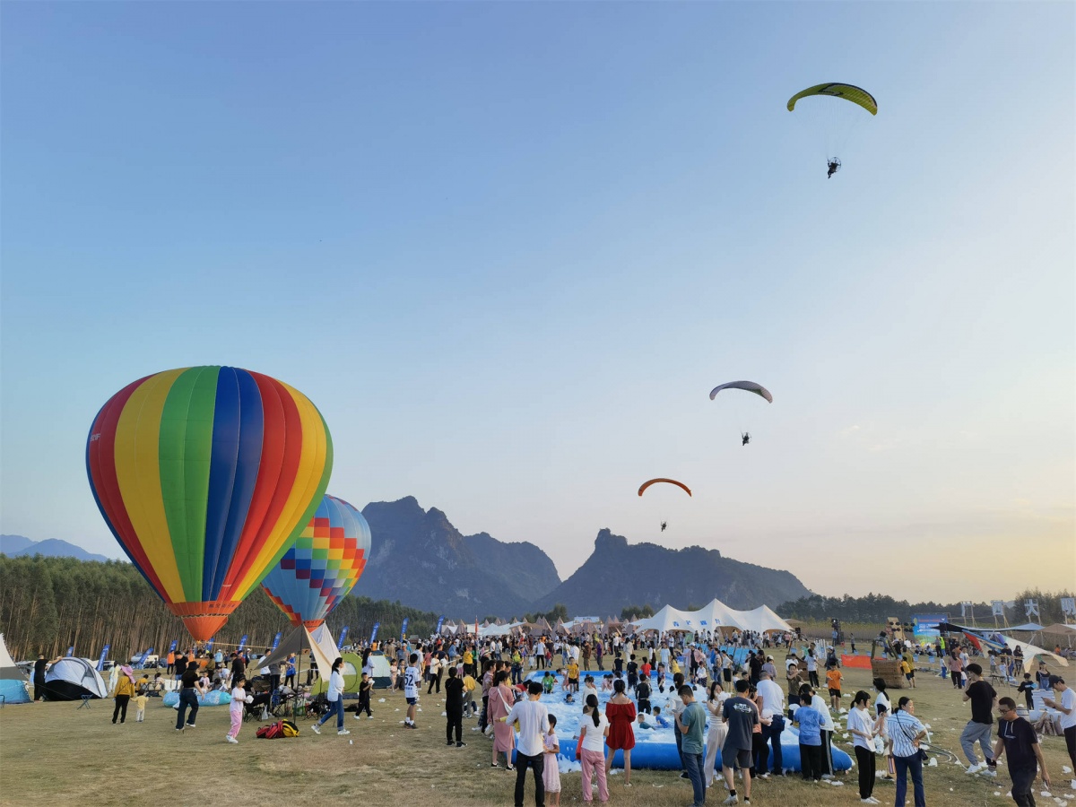 在当晚的开幕式现场,主办方同时升起了4个不同造型的热气球,在优美的大明山自然风光映衬下,更显壮观。此外,游客还能在露营区参与飞盘、航空知识猜谜、手掷泡沫飞机穿圈、套航空模型盲盒、折纸飞机比赛等趣味活动。