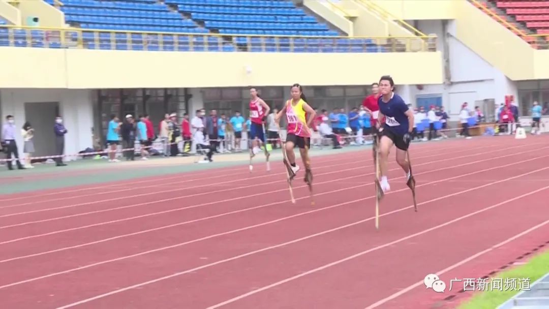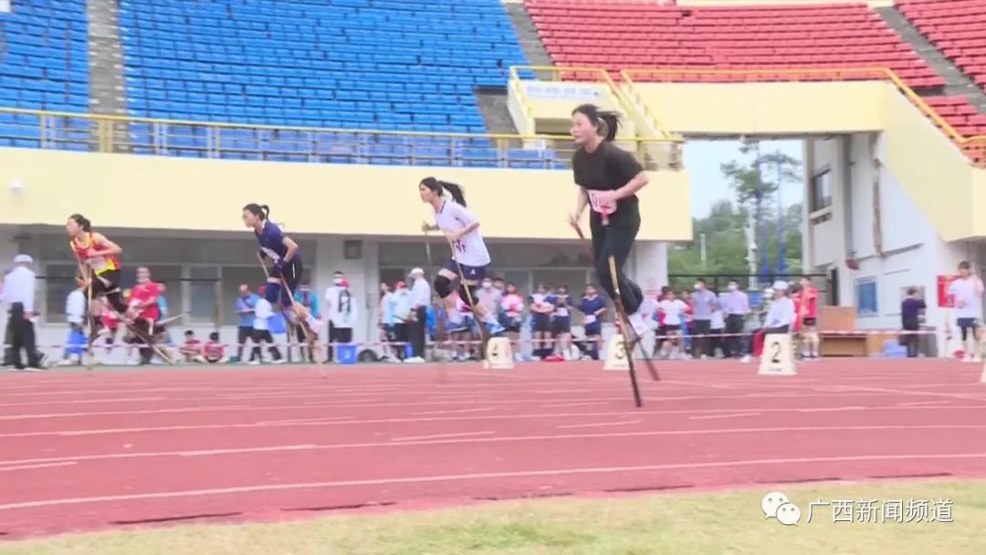 贵港市代表团高脚竞速运动员 何语然:技巧就是你要稳得住“马”,踩在上面的时候,你整个人的重心要跟“马”在一起,要同手同脚。