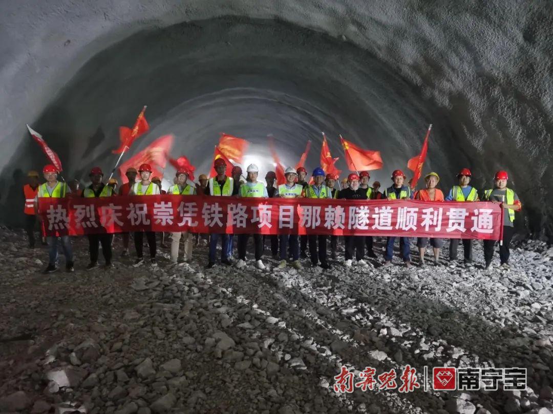 当天10时,崇凭段项目重难点工程之一的那赖隧道顺利贯通。那赖隧道位于崇左市龙州县板门村那赖屯附近,全长1862.748米,为正线双线隧道,最大埋深约206米。隧道内地质情况复杂,围岩等级多、岩溶发育强烈,施工难度大,对技术要求高。为确保隧道施工进度可控、安全可控、质量可控,参建单位坚持“一洞口一方案、一工序一审批”基本原则,实施“弱爆破、短进尺、少扰动、早喷锚、紧封闭”技术措施,严格执行超前地质探测与隐伏岩溶检测,保障施工整体可控。