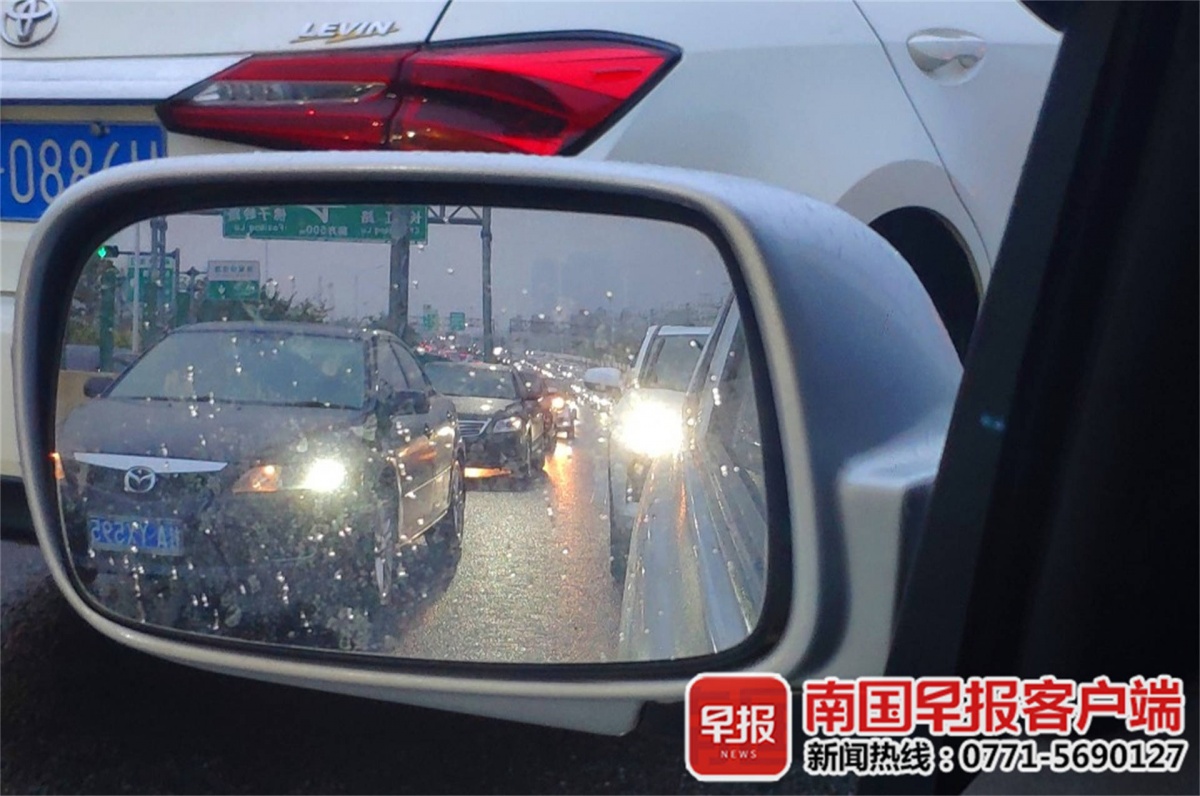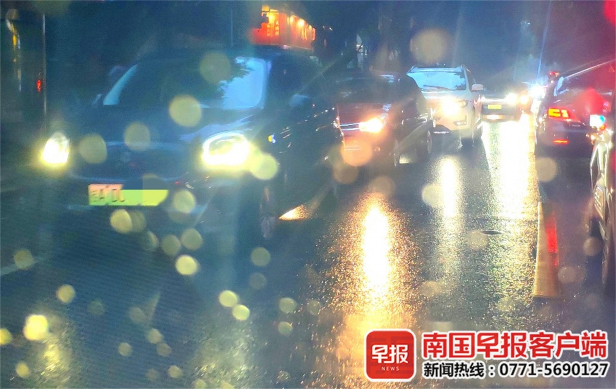 17日上午8时许,南宁市区雨天,天色暗,车辆开启大灯。