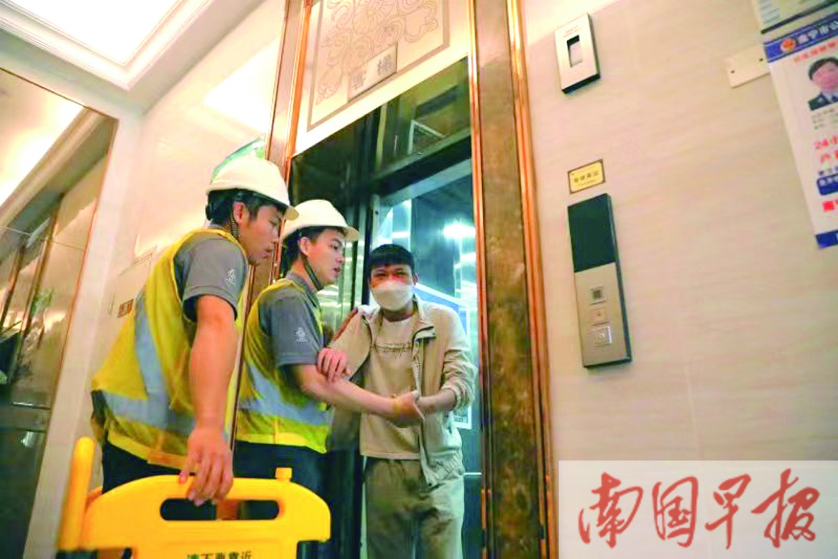 当天,在南宁市佛子岭路的霖峰壹号超高层(48层)住宅小区内,一台电梯在非平层区域发生故障造成停运,电梯内的两名业主立即利用电梯轿箱内的紧急呼叫装置和手机拨打救援电话。接到求救信号后,小区物业管理人员马上与被困人员沟通,了解对方的安全健康状况并进行安抚,同时通知电梯维保公司。几分钟后,电梯维保人员到达现场,确定电梯轿厢确切位置后,通过机房紧急电动运行救援和手动释放抱闸盘车救援两种方式,将电梯轿厢准确停到最近的平层处,成功解救被困人员。随后,电梯维保人员对电梯故障进行分析,排除故障及安全隐患后,电梯恢复正常运行。