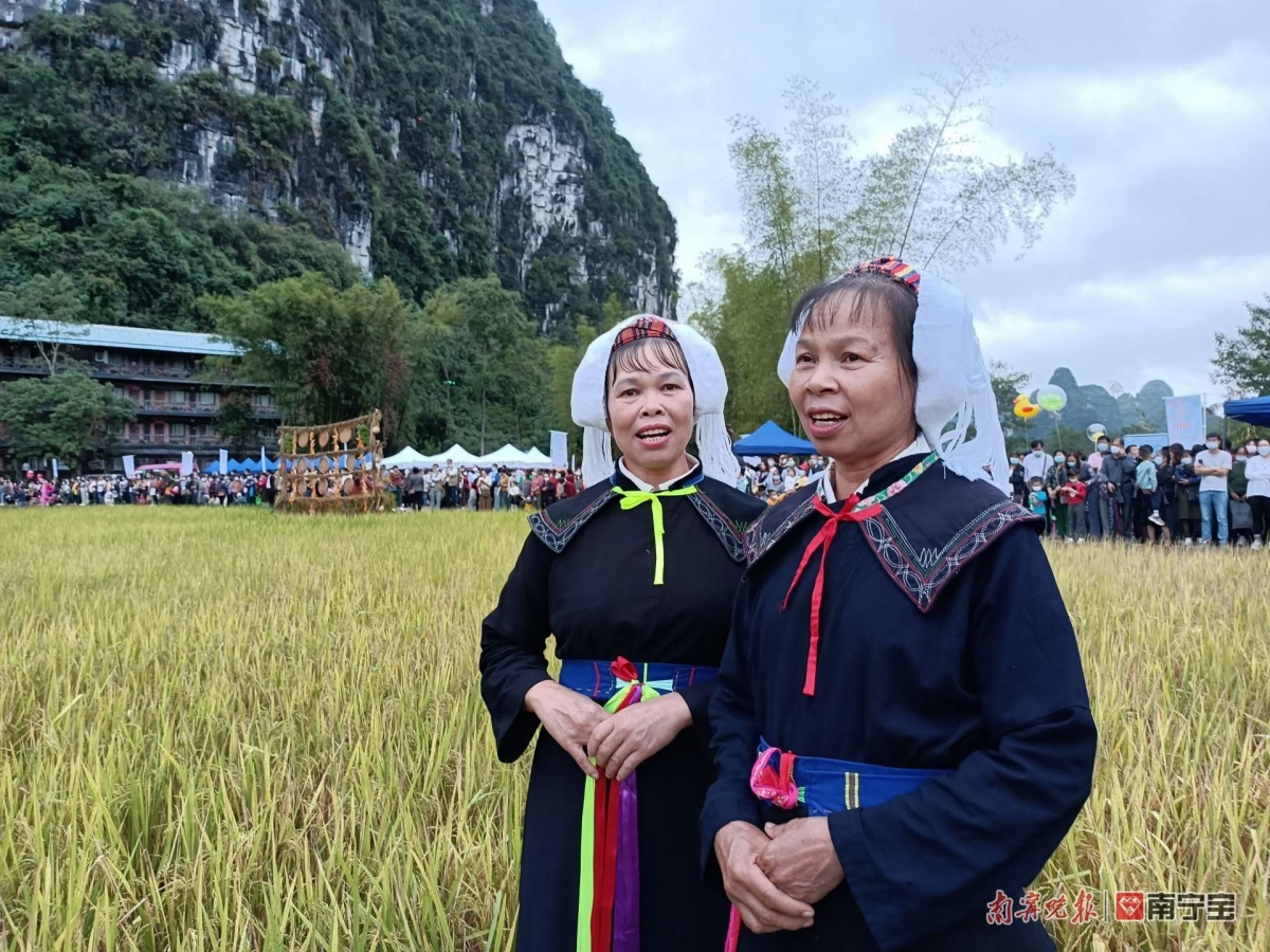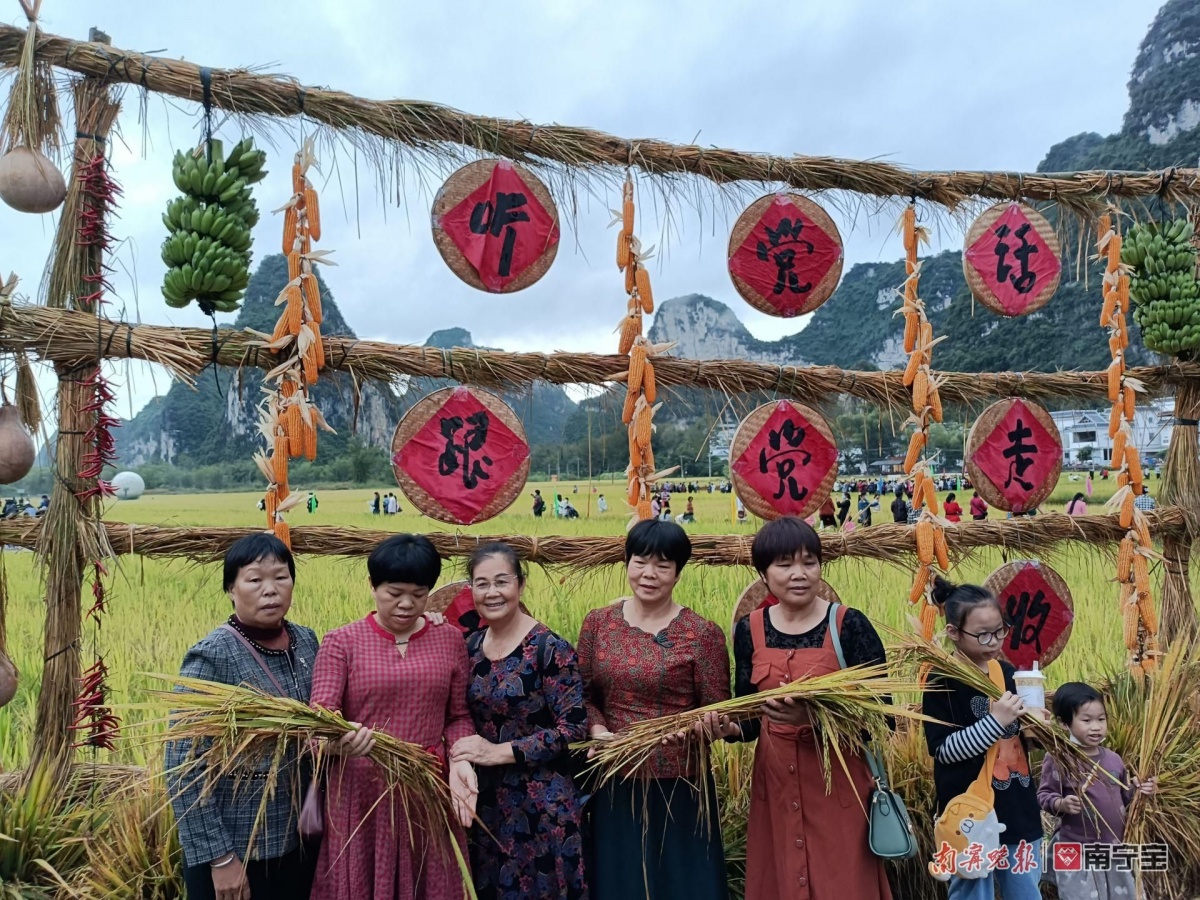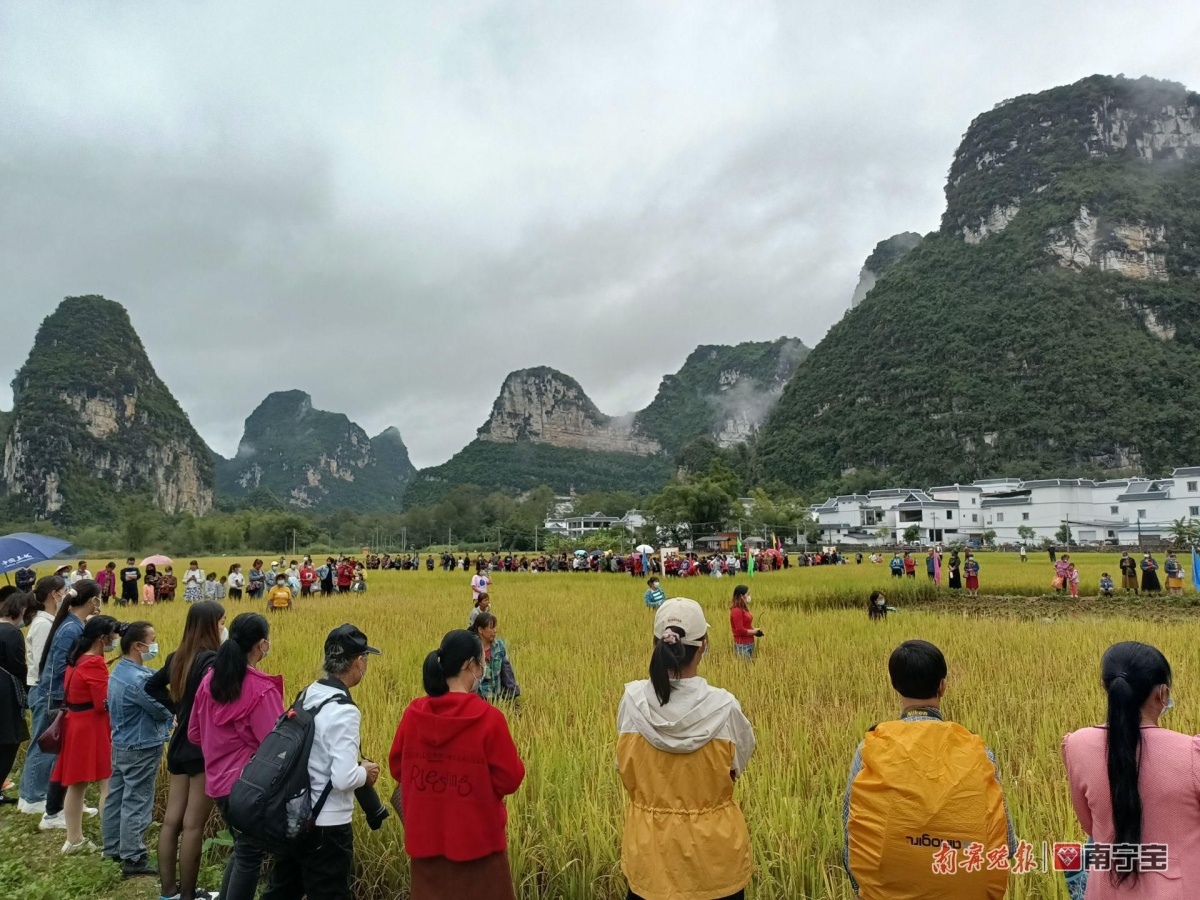 进入11月,中越边境大新县的明仕田园里,金黄色的稻田与静谧的山水风光融为一体,美如画卷。丰收节活动围绕“欢乐田园,自在明仕”的主题,展示一系列边关壮民族风俗的农耕稻作情景,众多游客和当地民众在“中越边境山水画廊”里体验收割稻谷体验、赶鸭摸鱼大赛、土味特色丰收宴等,体验“壮味”十足的田园生活。