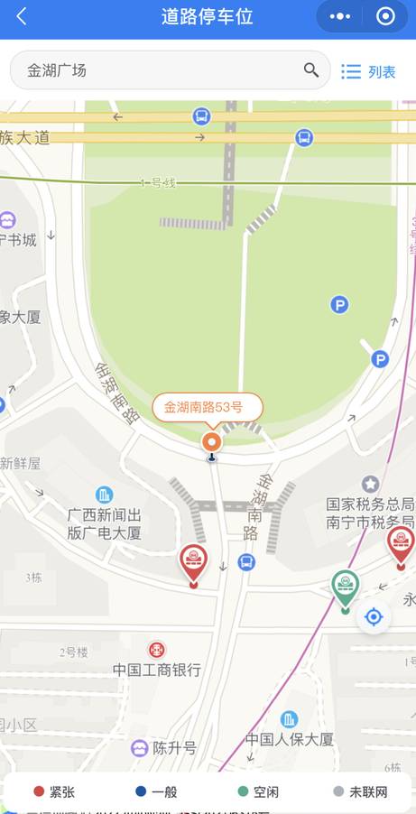 记者点击“道路停车位”按钮后,通过定位或者输入目的地,可实时查看周边道路停车位剩余情况:红色气泡代表车位紧张;绿色代表停车位空闲较多;蓝色代表一般。