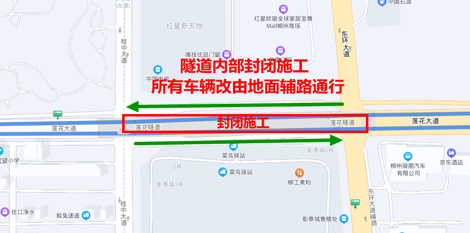 12月2日20时至12月5日6时临时封闭莲花下穿通道(唐家东路至蜈蚣岭路)进行维护施工,所有车辆改由地面莲花大道辅路与桂中大道和东环大道交叉路口通行。