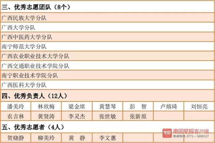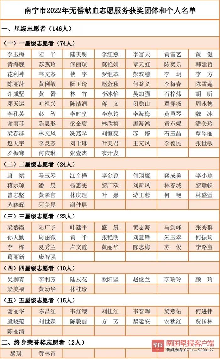 在2022年南宁市无偿献血志愿服务获奖名单中,李玉梅等146名“星级志愿者”、黎琪等2名“终身荣誉奖”获得者、广西民族大学分队等8个“优秀志愿团队”、潘美玲等12名“优秀负责人”、贺晓静等4名“优秀志愿者”榜上有名。