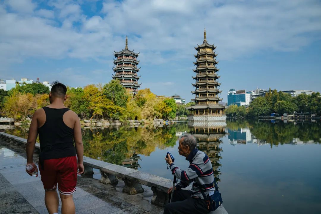 在外工作的桂林好友听说我来了,不厌其烦地敲出她的推荐线路:“桂林宾馆位置很好,出门右转可以散步到日月双塔,再到漓江边的象鼻山一带。出门向左,沿着湖可以一直走到桂湖老人山。桂林的步道有一种特别的美,我百走不厌。如果有朋友来,我会带他去榕湖湖心亭喝茶聊天,最惬意不过。”