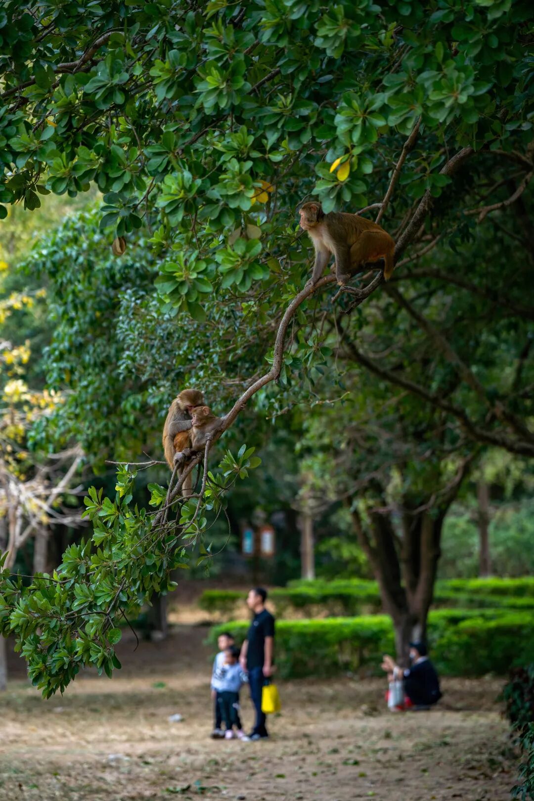 漓江东岸,如北斗七星般排布的七个山头就是七星山,以此基础建立了的七星景区是桂林最大的景区,桂海碑林及博物馆也是景区的一部分。若不怕辛苦,随便爬上其中一座山,漓江两岸的风景便尽收眼底。山脚下有许多猴子自由地跑来跑去,大草地上,全是猴子和孩子。一个调皮的孩子被猴群围住,爸爸健步上前,大喝解围。我目瞪口呆地转头问身边坐着的一个妈妈——她的两个孩子正在不远处吹着彩色的泡泡,猴子就在树梢上,“没有防护,你不担心吗?”妈妈大笑:“你是来旅游的吧?这有什么好担心的,不招它(指猴子)就没事的!”