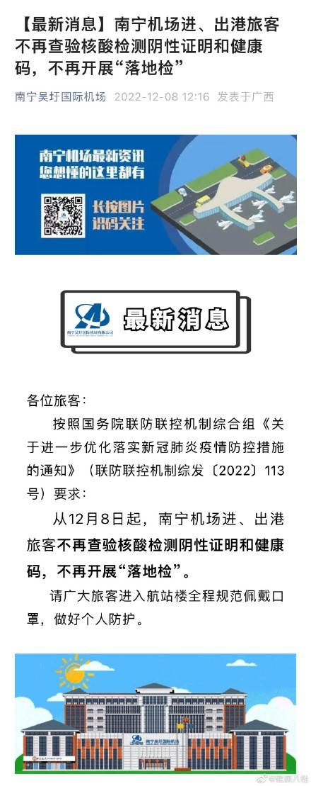 12月8日12点,南宁吴圩国际机场官方公众号发布通知称,从12月8日起,南宁机场进、出港旅客不再查验核酸检测阴性证明和健康码,不再开展“落地检”。通知全文如下: