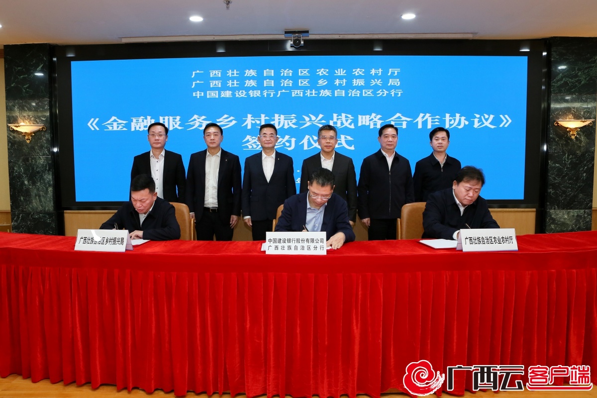 建行广西区分行与自治区农业农村厅、乡村振兴局签署《金融服务乡村振兴战略合作协议》。