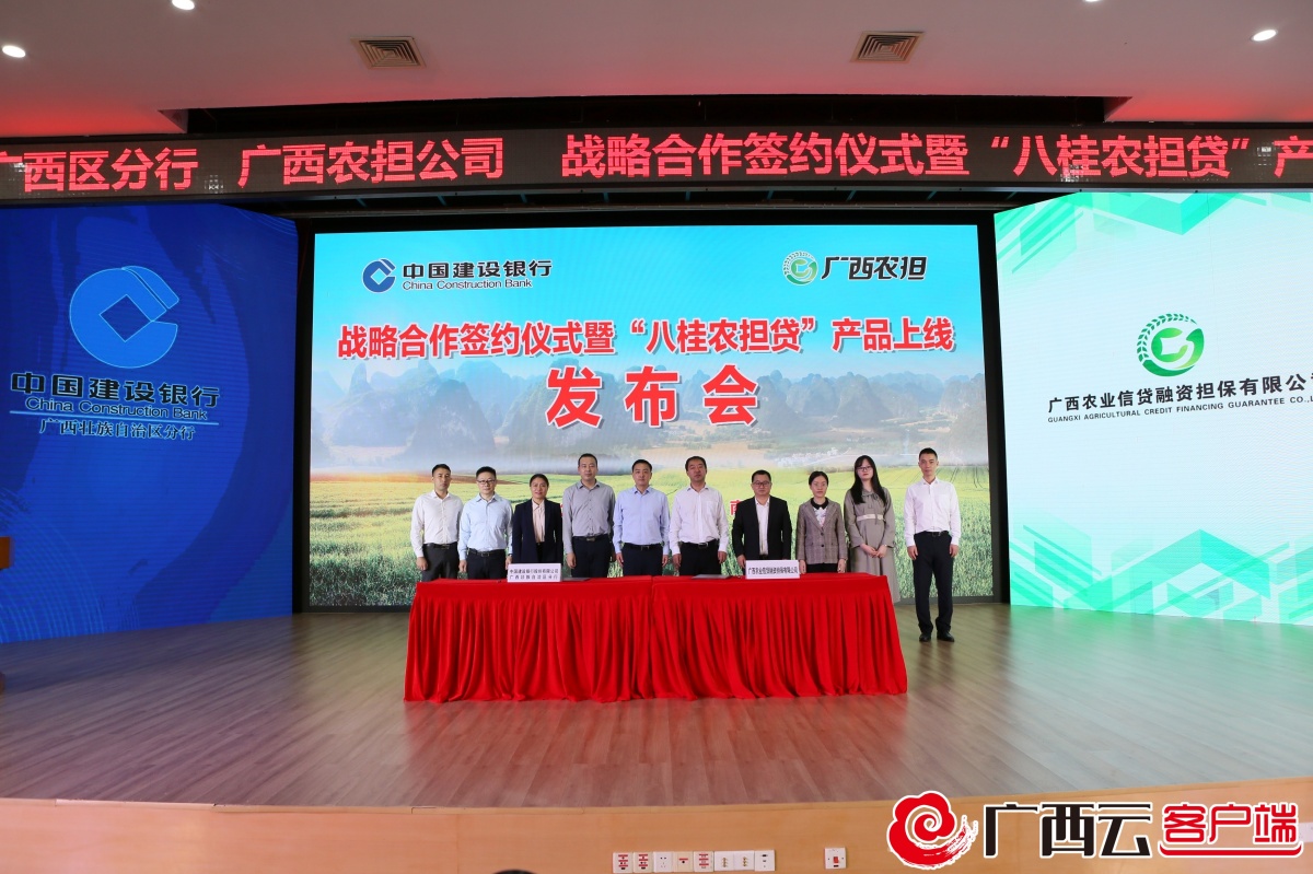 建行广西区分行与广西农业信贷融资担保有限公司举办战略合作签约仪式暨“八桂农担贷”产品发布会。