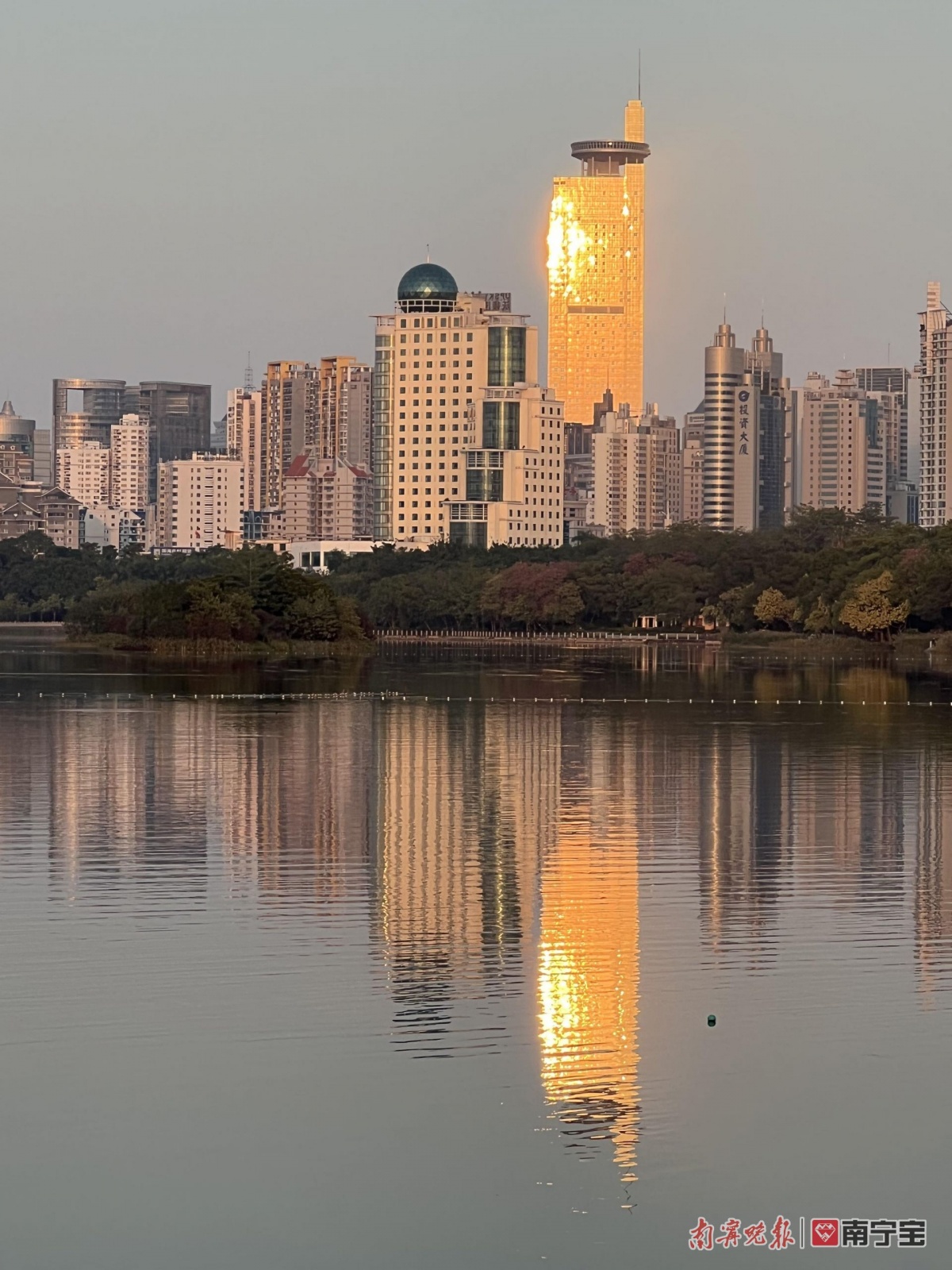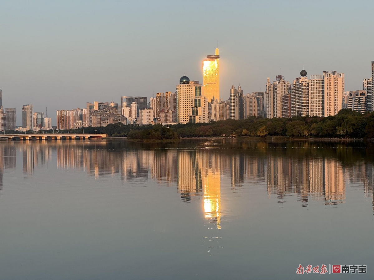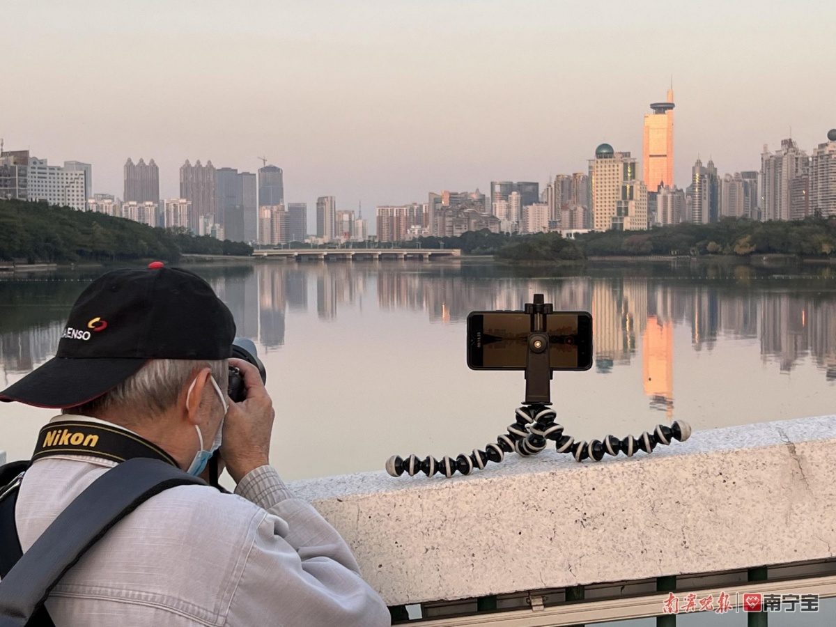 这两天,南宁天气晴好 ,日落之前,便会有一群摄影爱好者在南湖西岸蹲守。他们的目的很明确:就是想在夕阳落山前照射到地王大厦的那一刻。