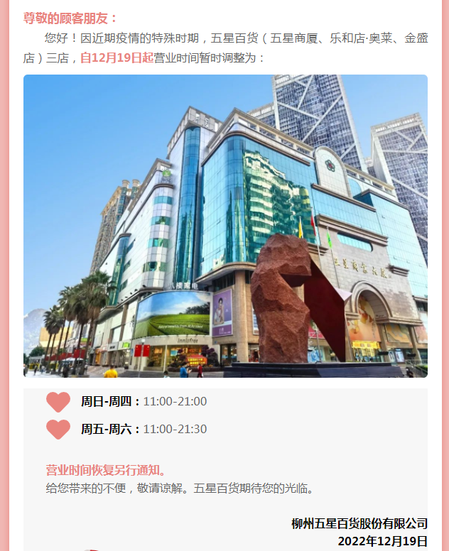 五星百货包括五星商厦、乐和店·奥莱、金盛店等三店营业时间调整为周日至周四11:00~21:00,周五至周六11:00~21:30。