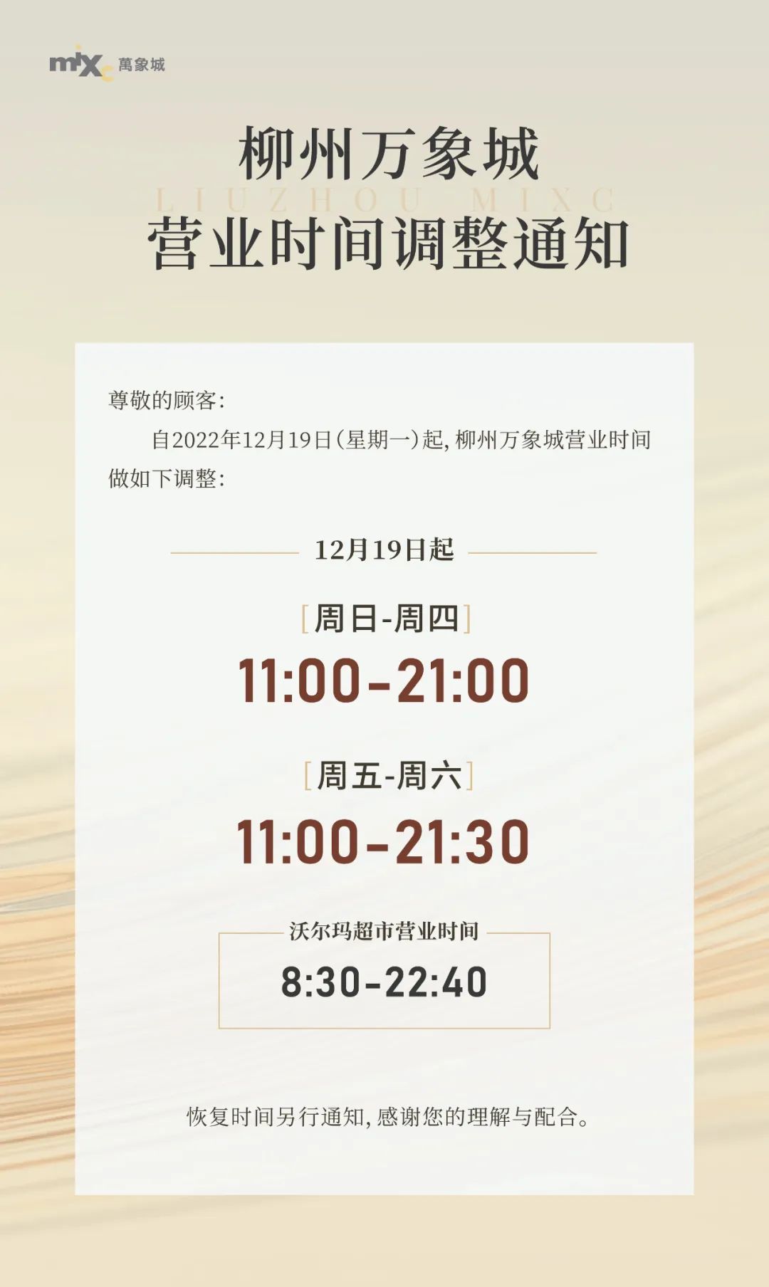 柳州万象城营业时间调整为周日至周四11:00~21:00,周五至周六11:00~21:30。其中,沃尔玛超市营业时间调整为8:30~22:40。