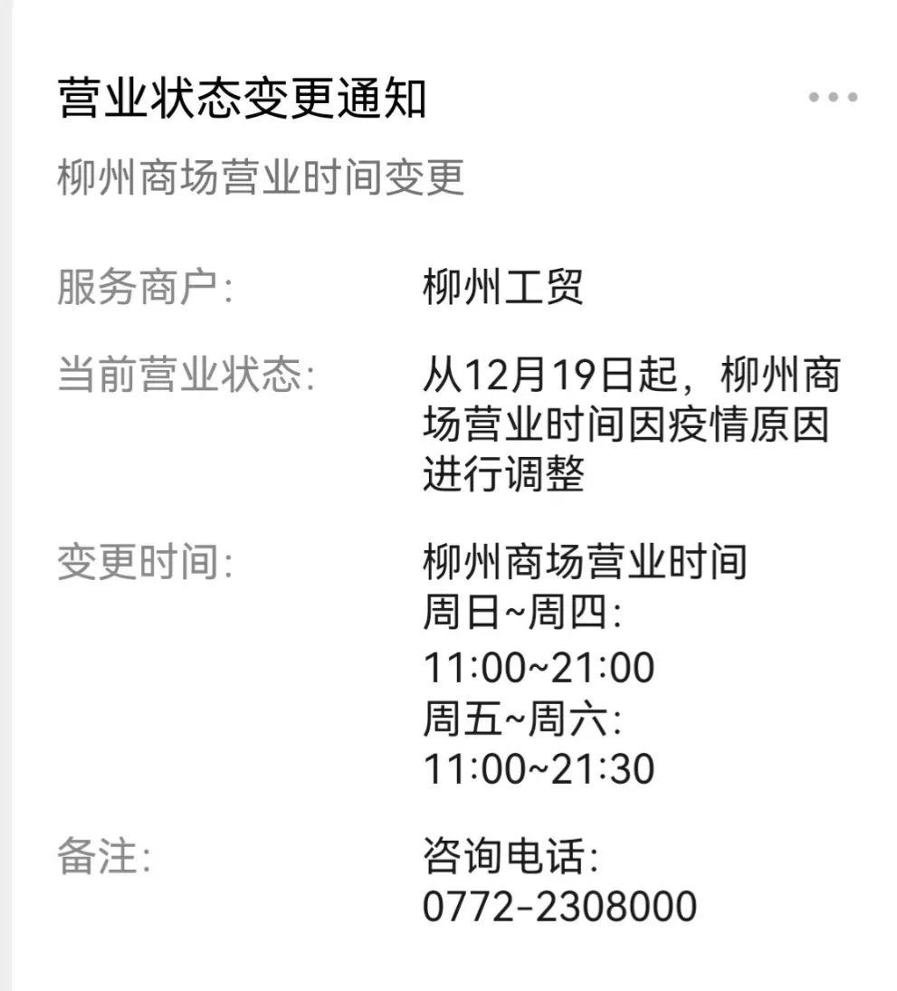 柳州工贸发布通知,19日起,柳州商场营业时间调整为周日至周四11:00~21:00,周五至周六11:00~21:30。