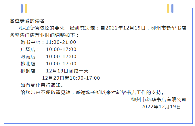 柳州市新华书店各零售门店营业时间调整如下:购书中心:11:00~21:00;广场店:10:00~17:00;河南店:10:00~17:00;柳北店:10:00~17:00;柳钢店:12月20日起10:00~17:00。