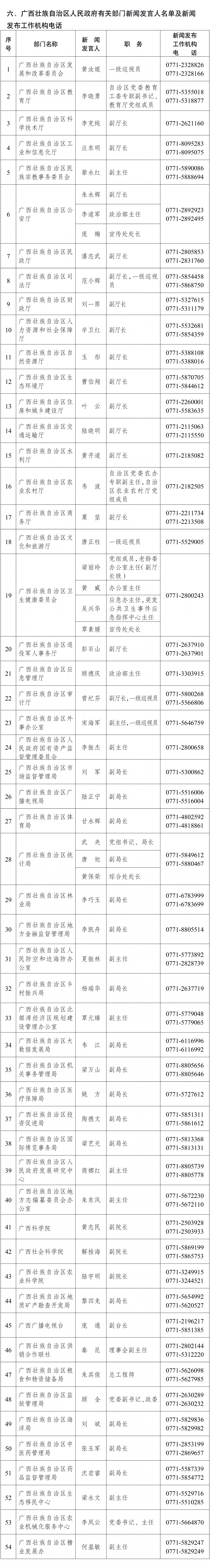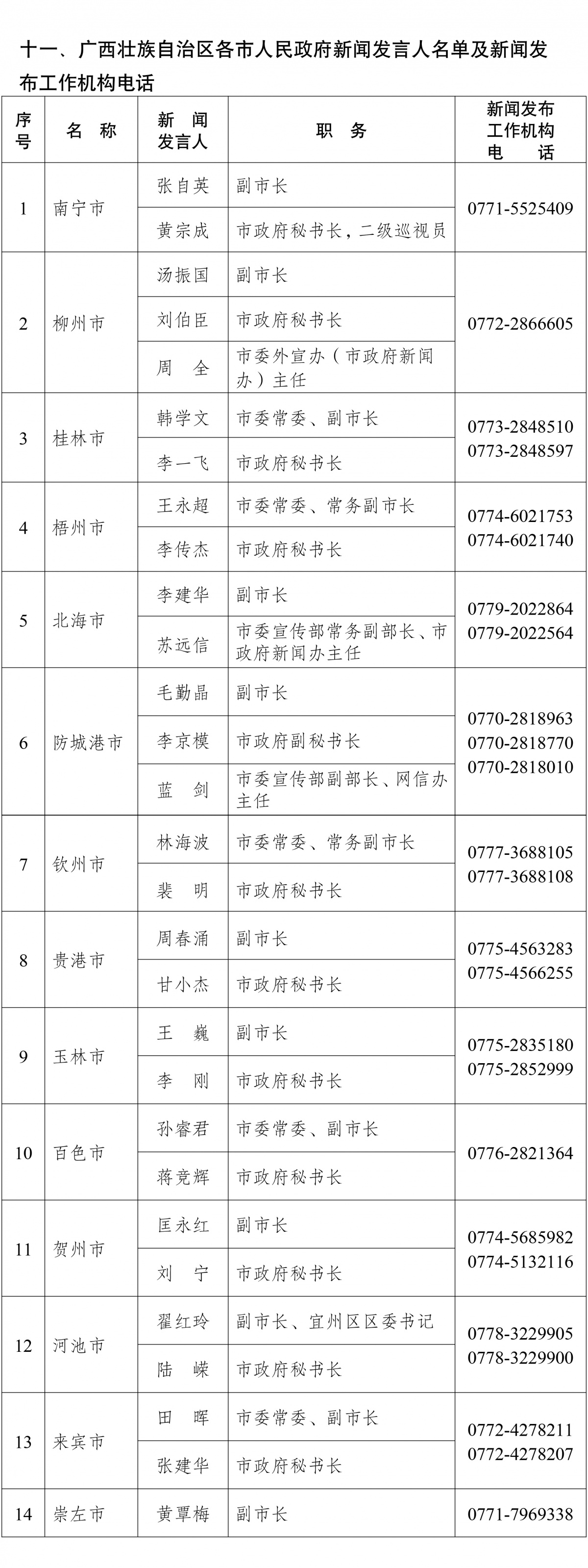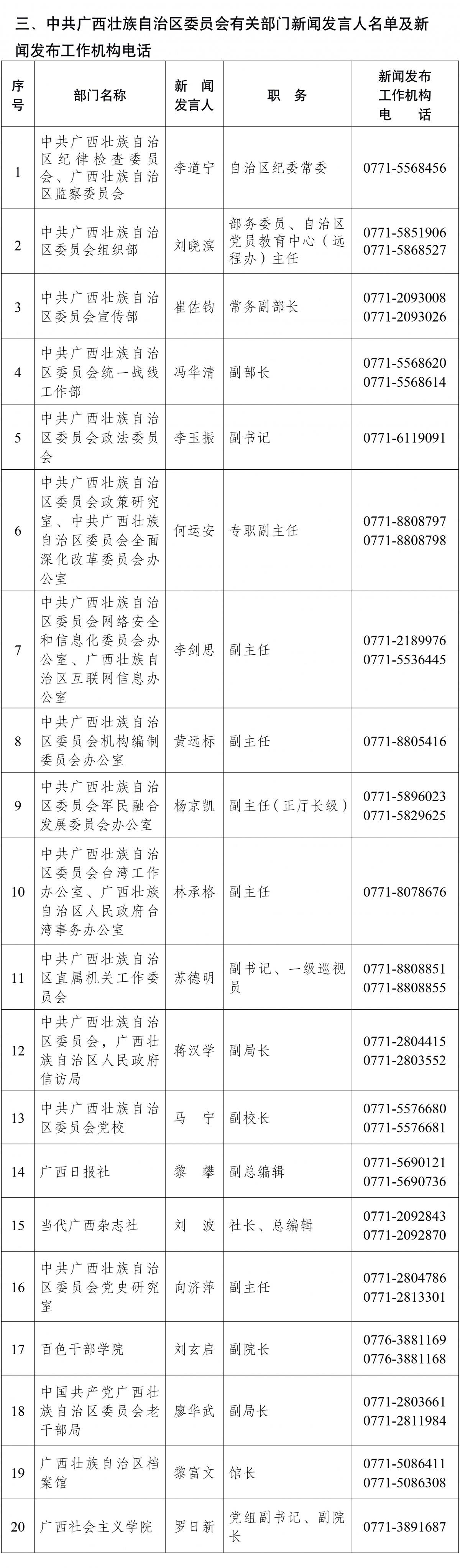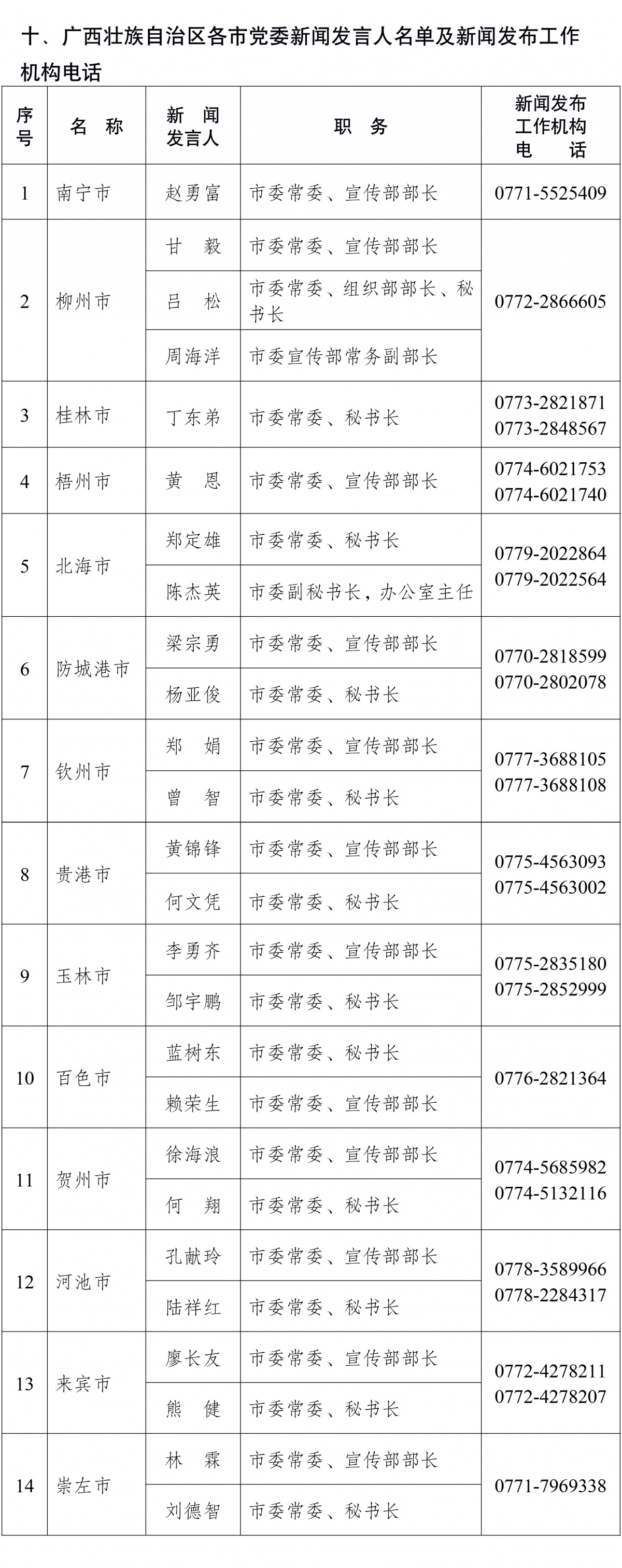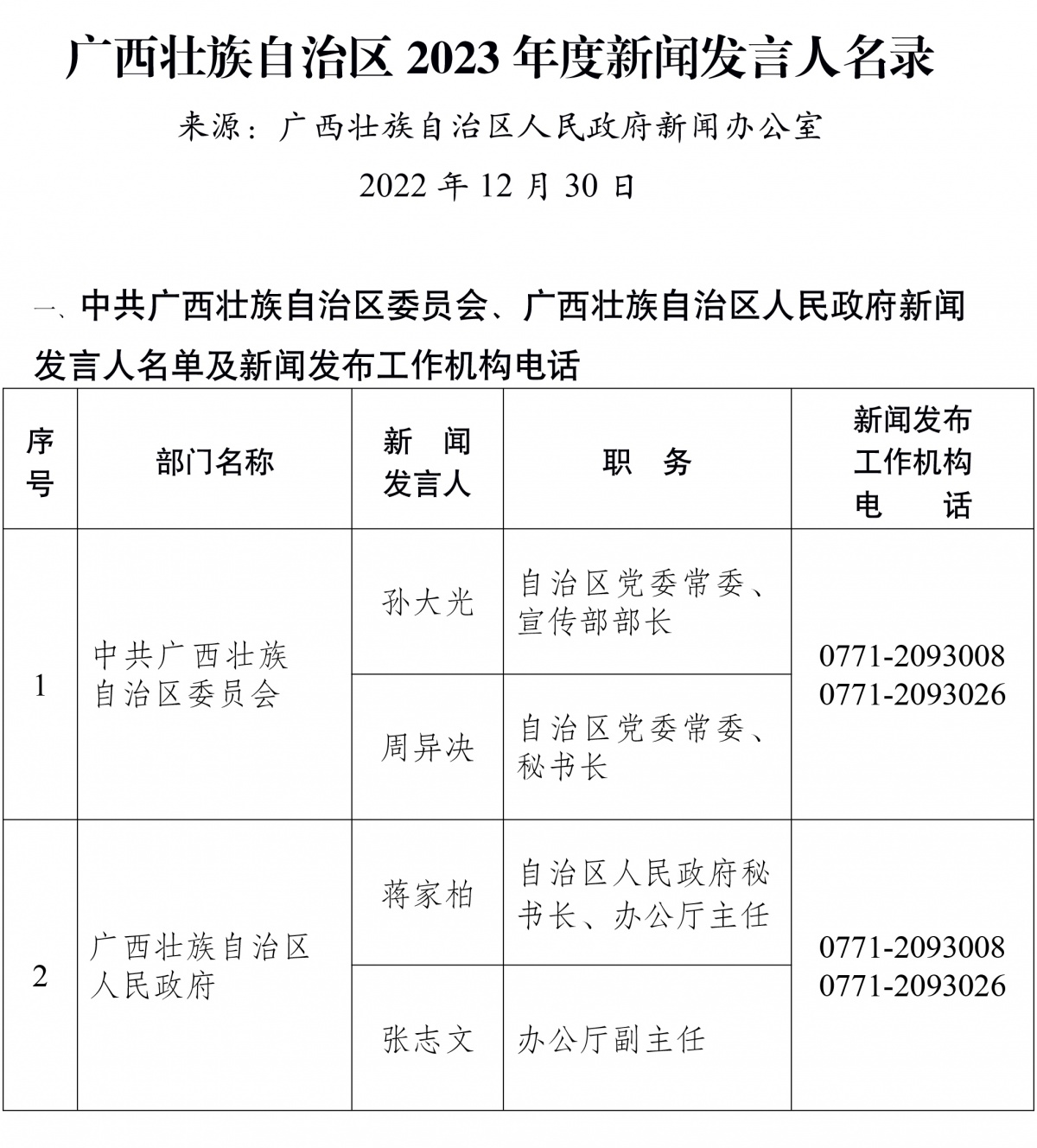 2022年12月30日,自治区政府新闻办公室公布了广西壮族自治区2023年度新闻发言人名录。此次公布的新闻发言人共276位。其中,自治区党委新闻发言人2位,自治区政府新闻发言人2位,自治区党委办公厅、人大办公厅、政府办公厅、政协办公厅,自治区党委有关部门,自治区高级法院、自治区检察院,自治区人民团体,自治区政府有关部门,中央部委驻桂有关部门,区管企业、高校的新闻发言人217位,14个设区市党委、政府新闻发言人55位。