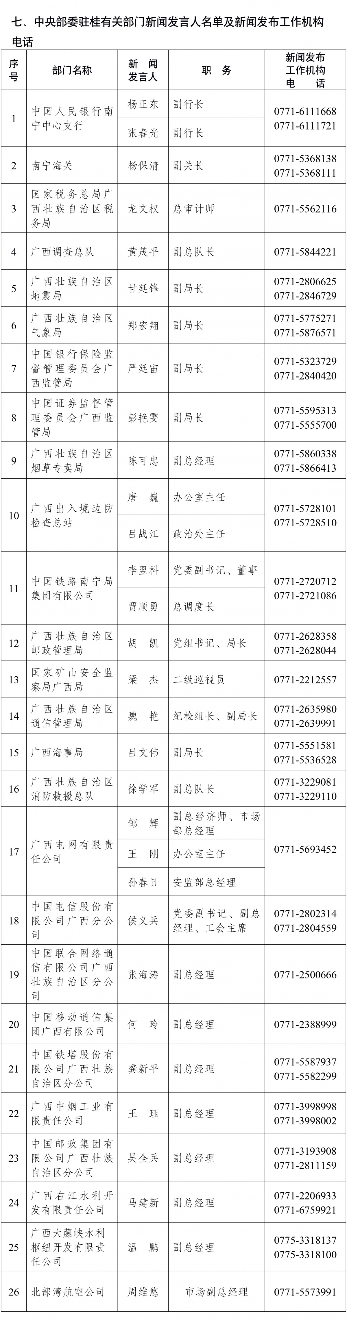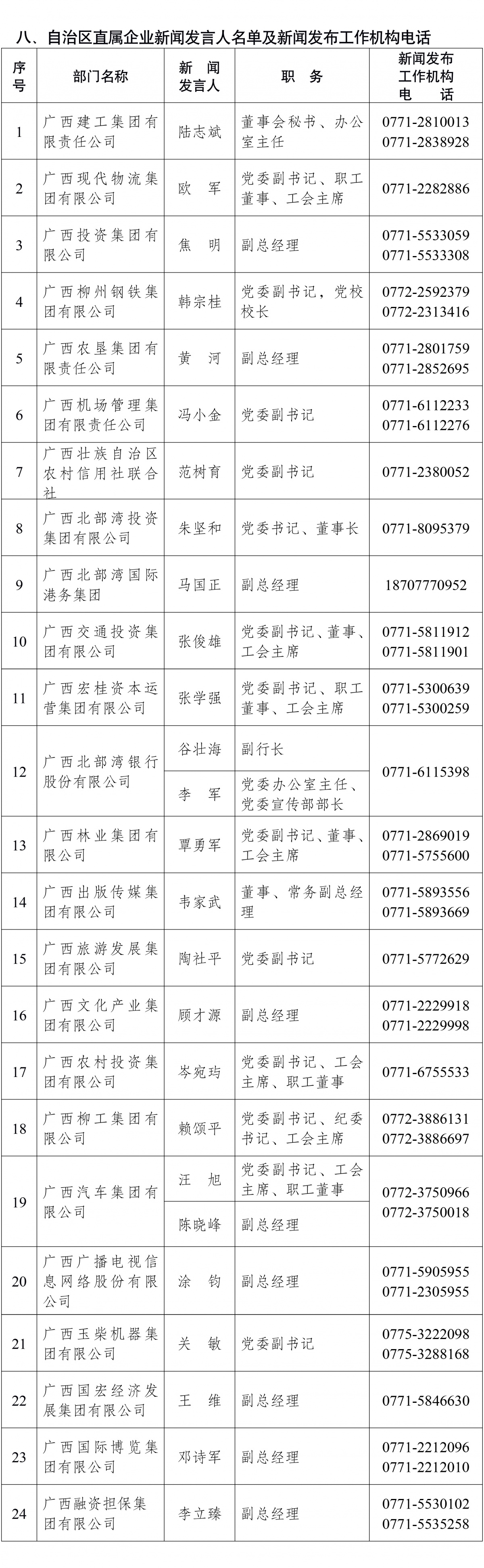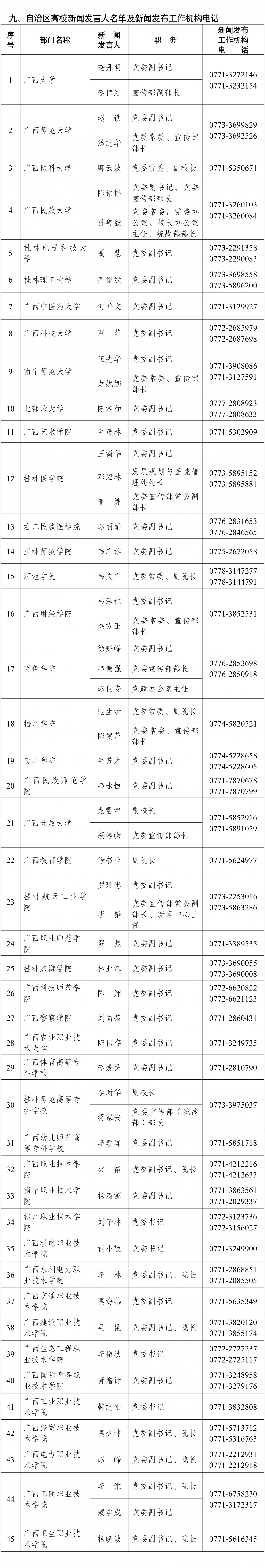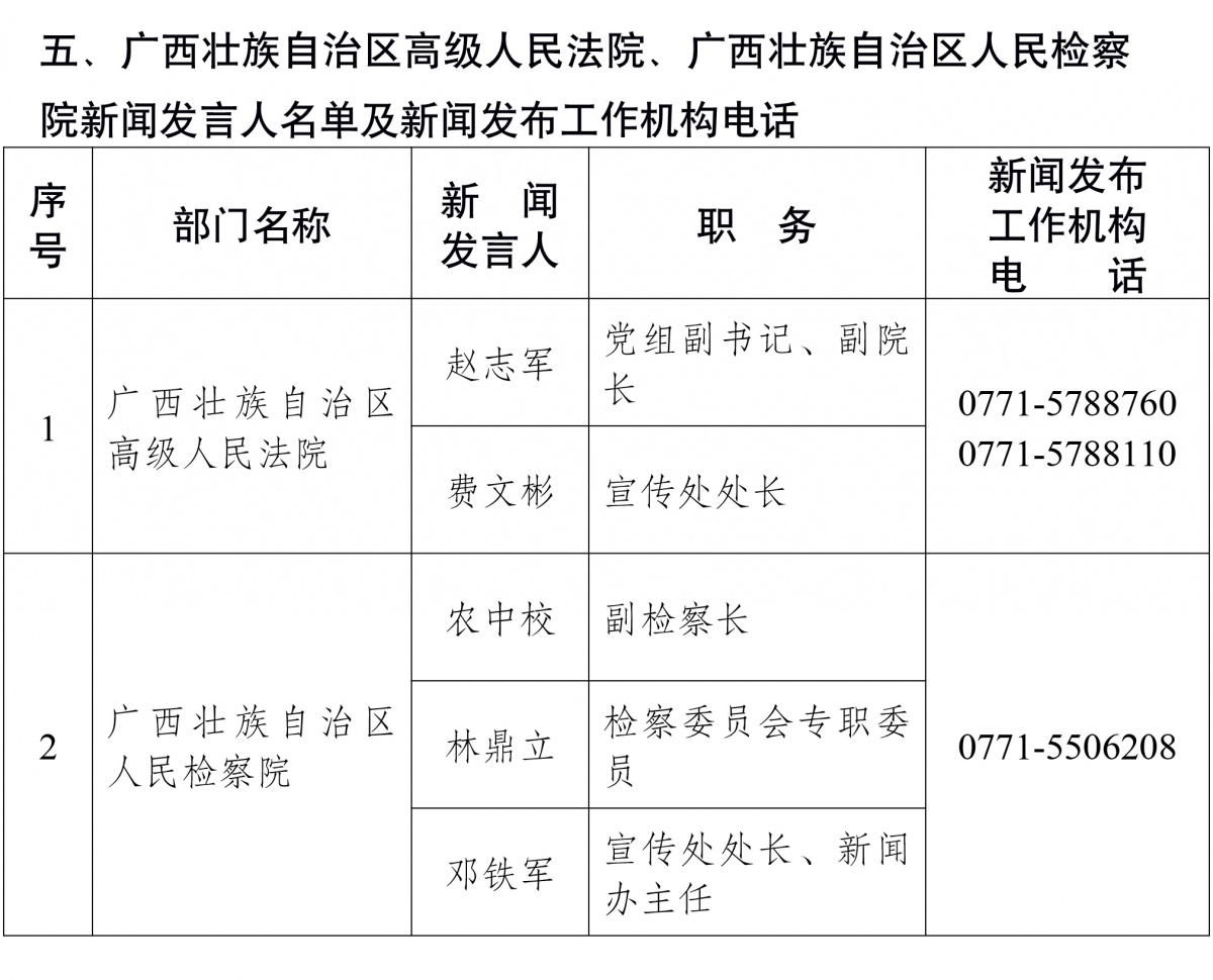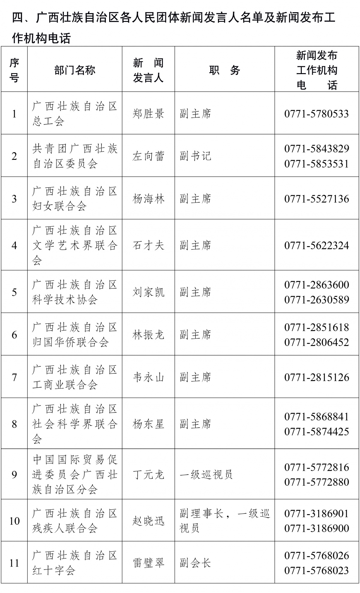 2022年12月30日,自治区政府新闻办公室公布了广西壮族自治区2023年度新闻发言人名录。此次公布的新闻发言人共276位。其中,自治区党委新闻发言人2位,自治区政府新闻发言人2位,自治区党委办公厅、人大办公厅、政府办公厅、政协办公厅,自治区党委有关部门,自治区高级法院、自治区检察院,自治区人民团体,自治区政府有关部门,中央部委驻桂有关部门,区管企业、高校的新闻发言人217位,14个设区市党委、政府新闻发言人55位。