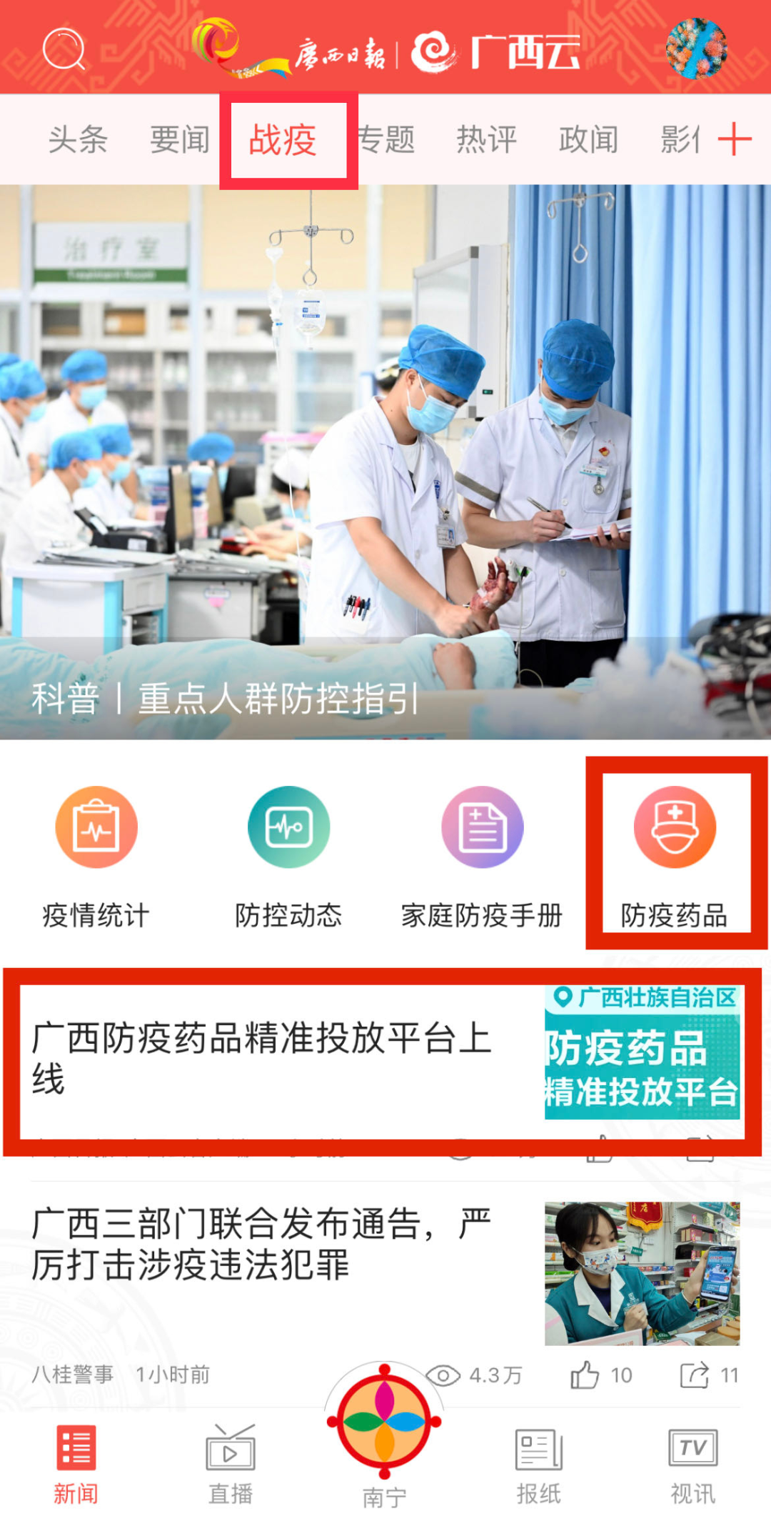 2.也可以点击广西云客户端的“战疫频道-防疫药品”或点击“广西防疫药品精准投放平台上线”的相关稿件,进入“广西防疫药品精准投放平台”。↓↓