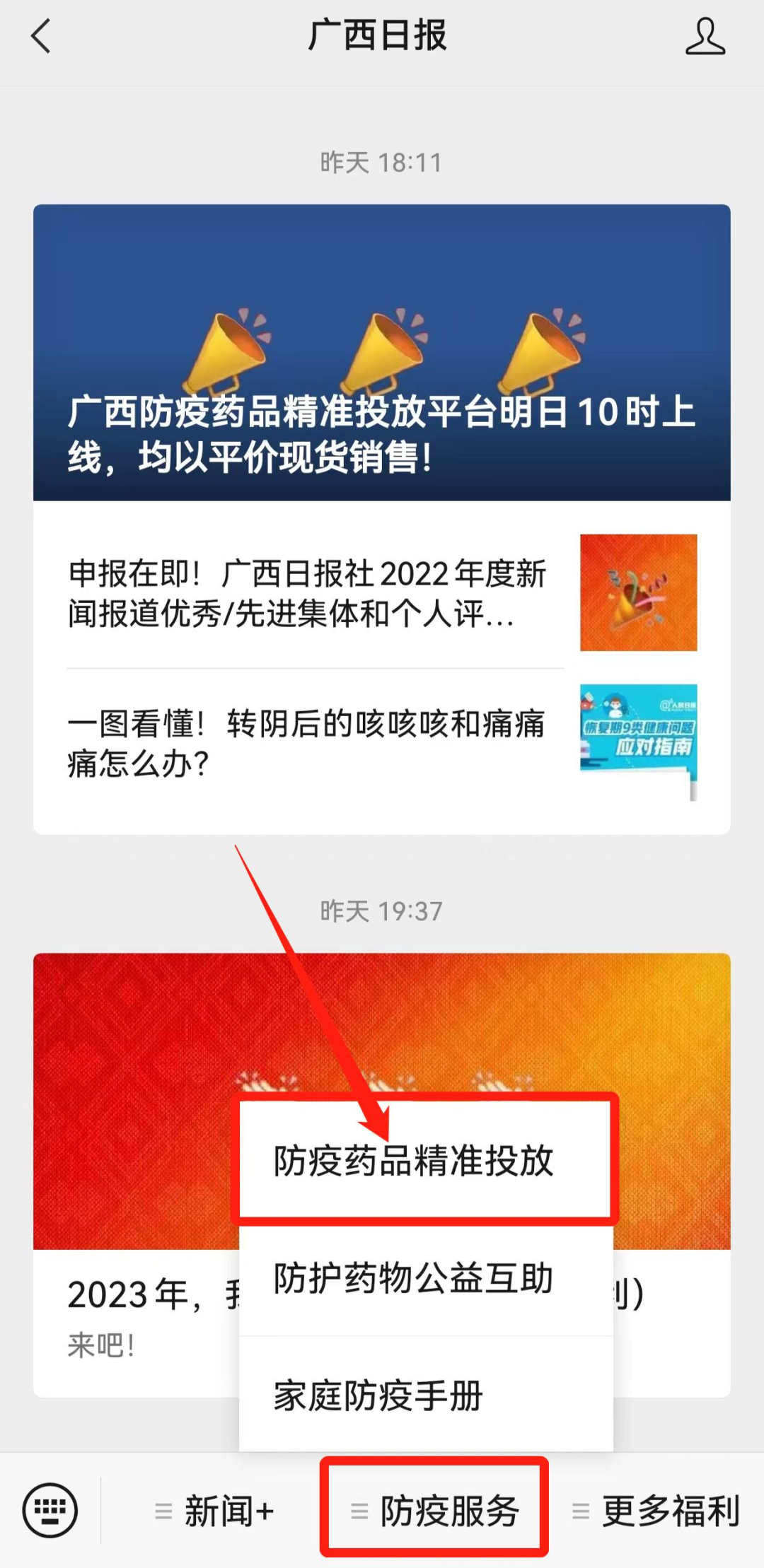 1.广西用户可通过“广西日报微信公众号菜单栏-防疫服务-防疫药品精准投放”的路径,进入“广西防疫药品精准投放平台”。