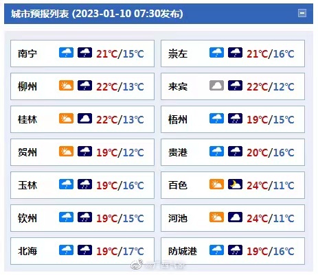 南宁市:今天白天阴天间多云有分散小雨,今天晚上小雨,局地中雨,有雾,东北风1~2级,最高气温21℃,最低气温15℃。